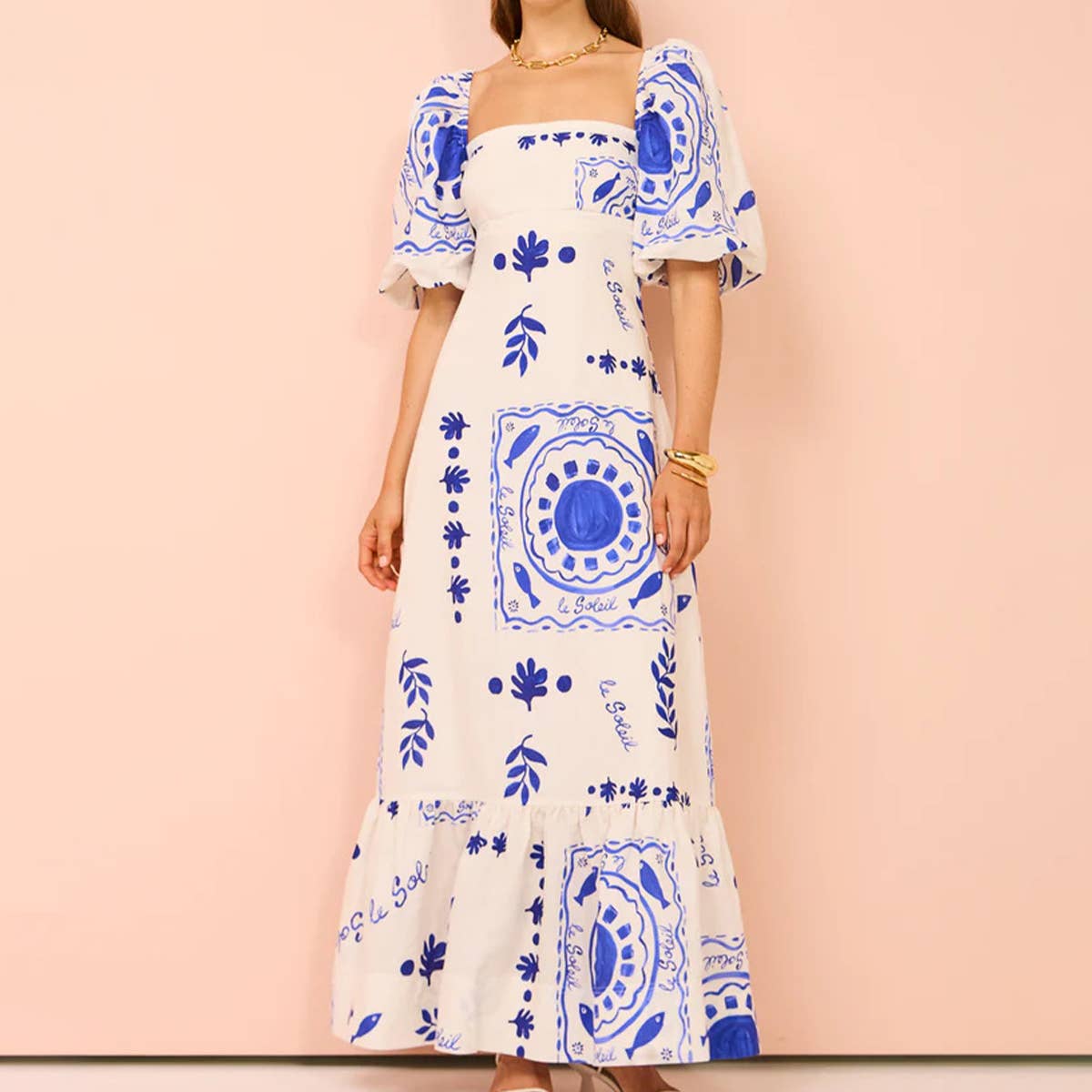 Casual line-neck print lantern sleeve dress
