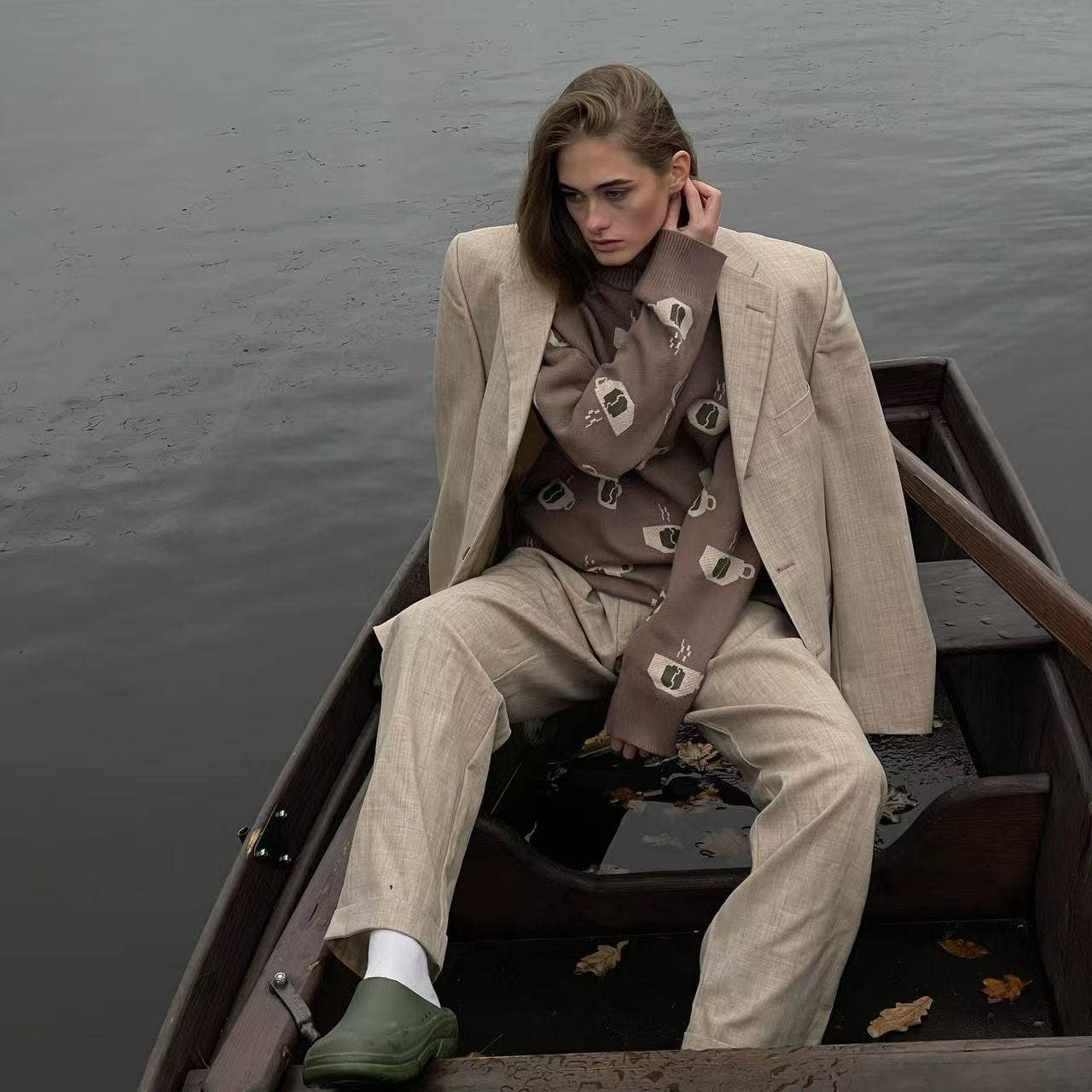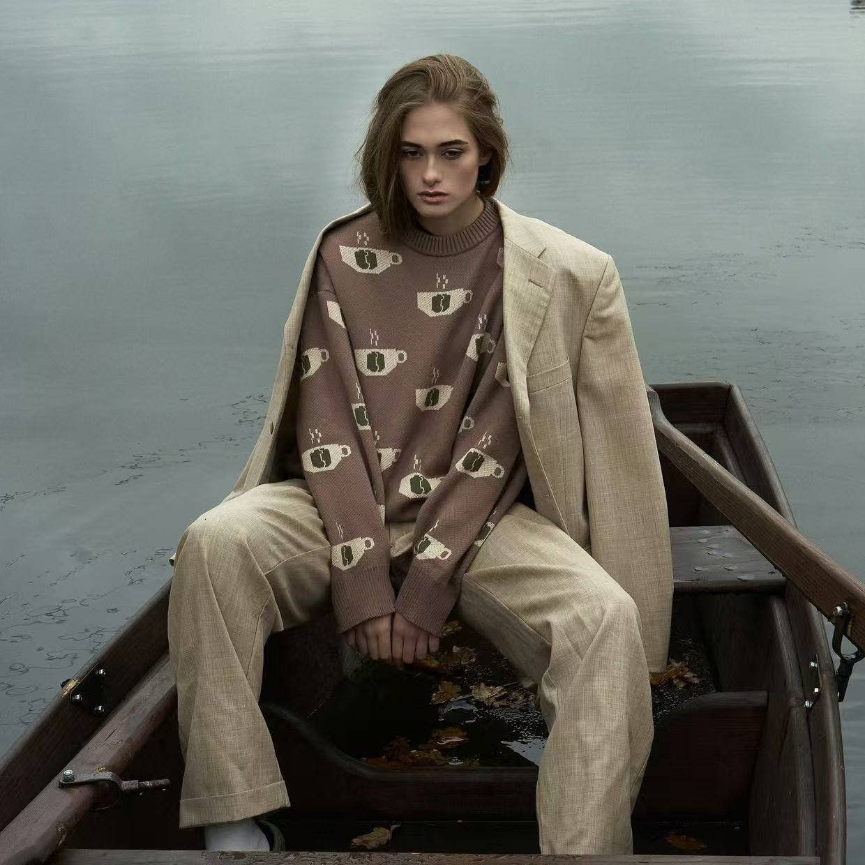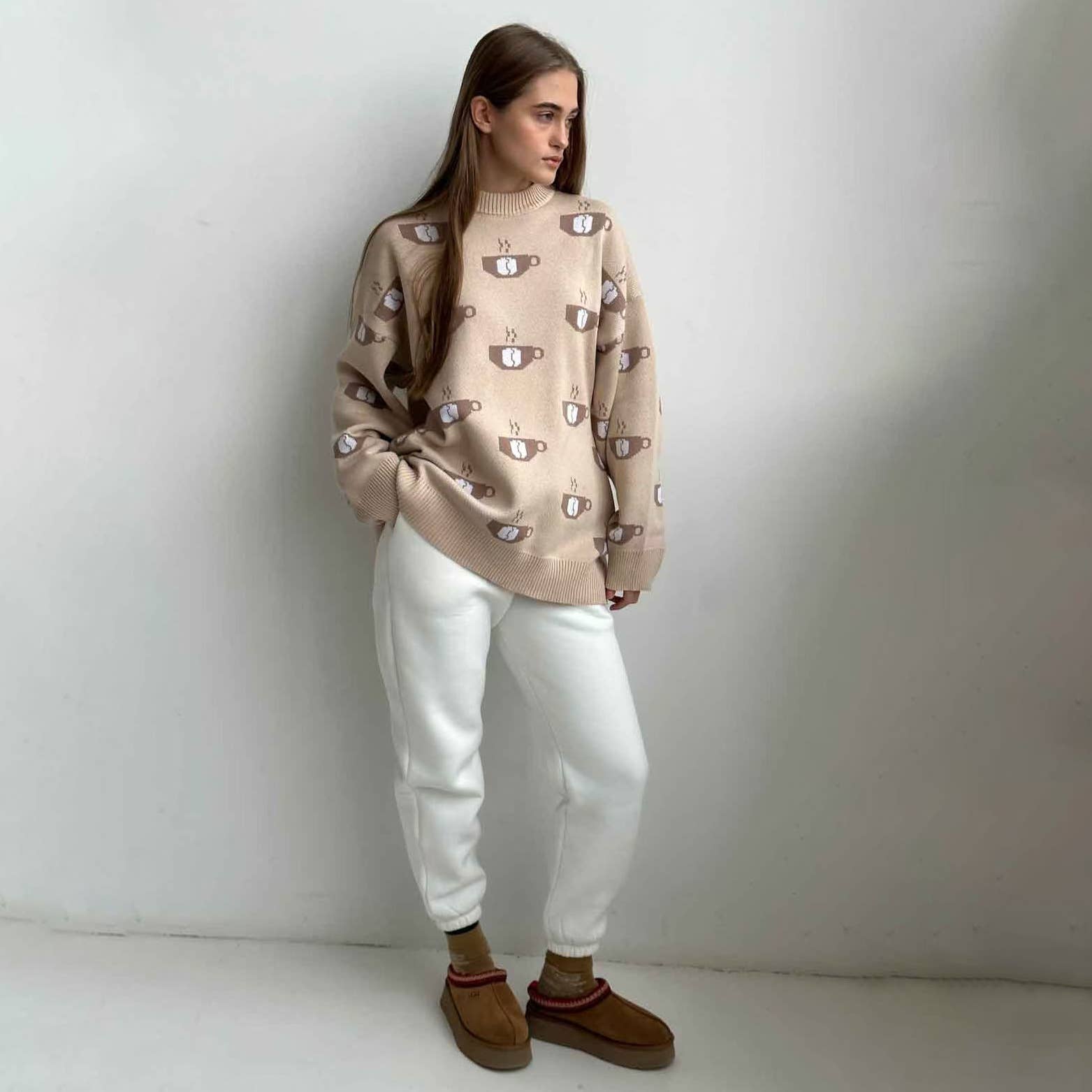 Coffee jacquard semi-turtleneck sweater