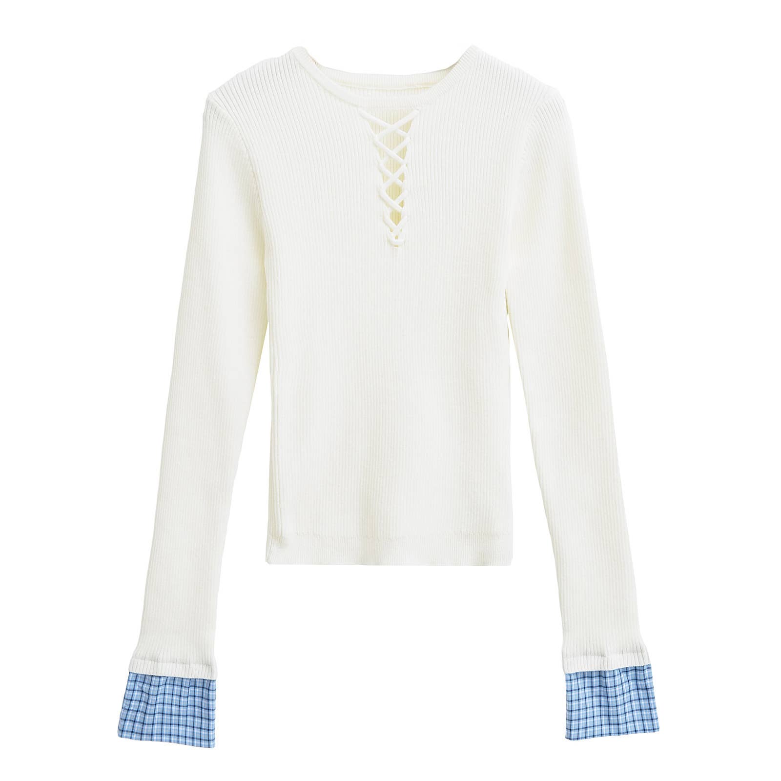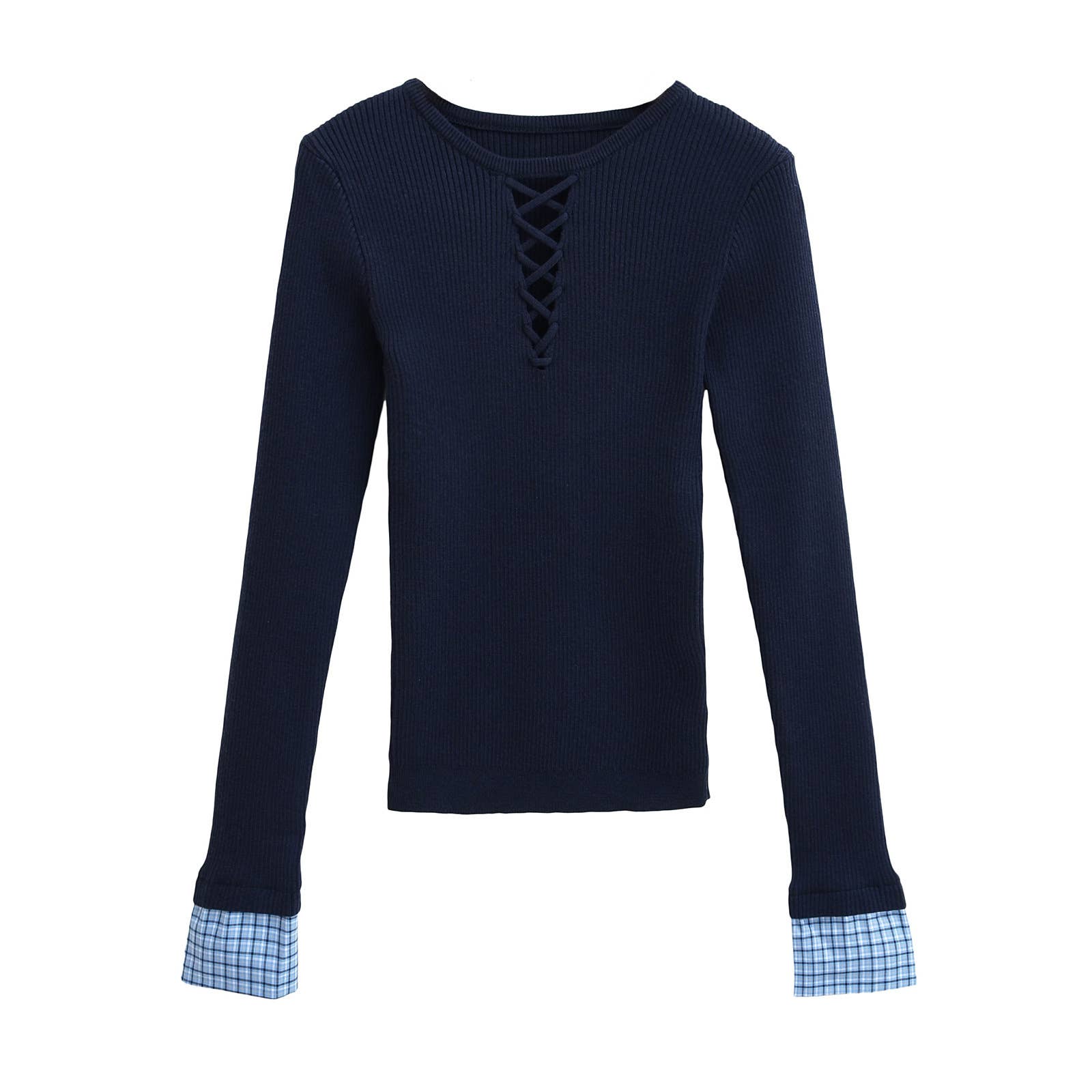 Contrasting plaid patchwork long-sleeved knitwear
