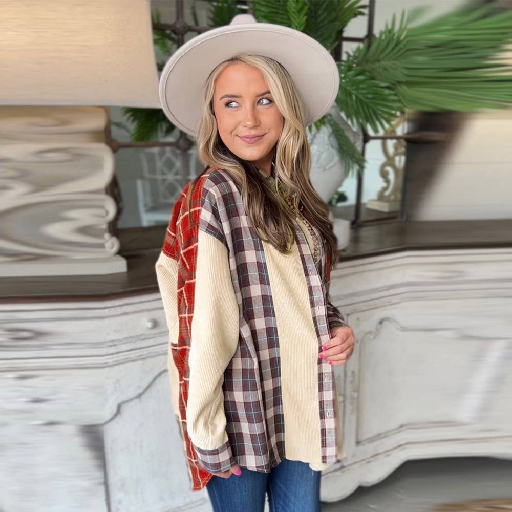 CORDUROY CHECK PATCHWORK SINGLE BREASTED SHIRT