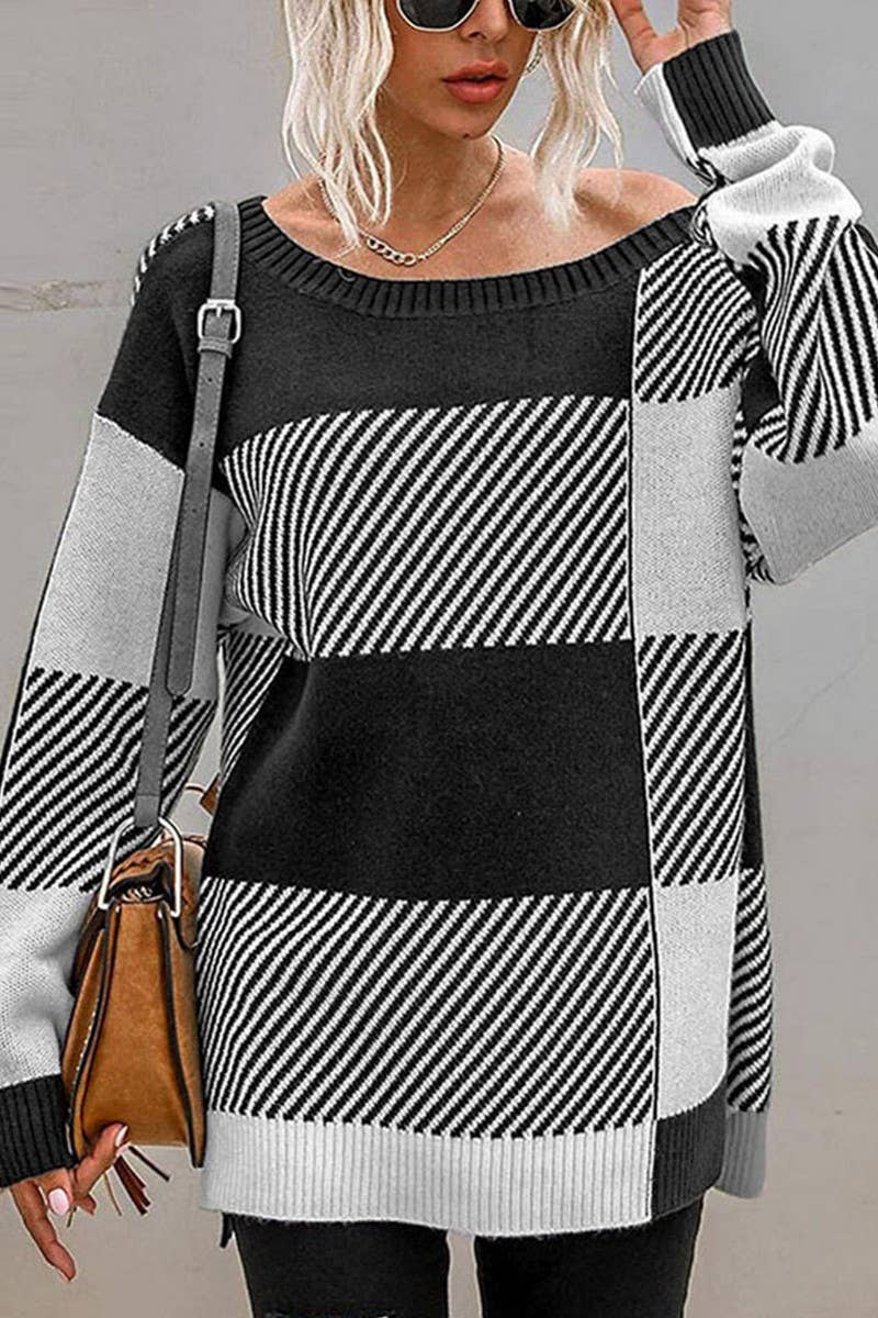 Cotton fine yarn matching plaid round neck loose knit