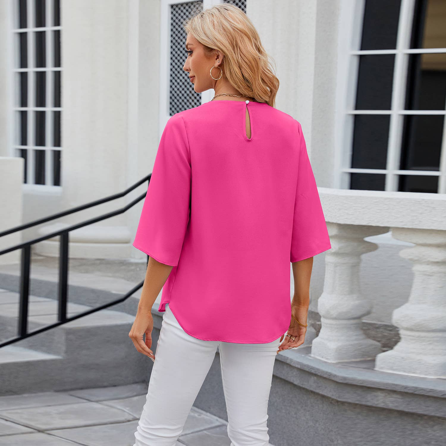 Crew-neck loose chiffon with five-quarter sleeves