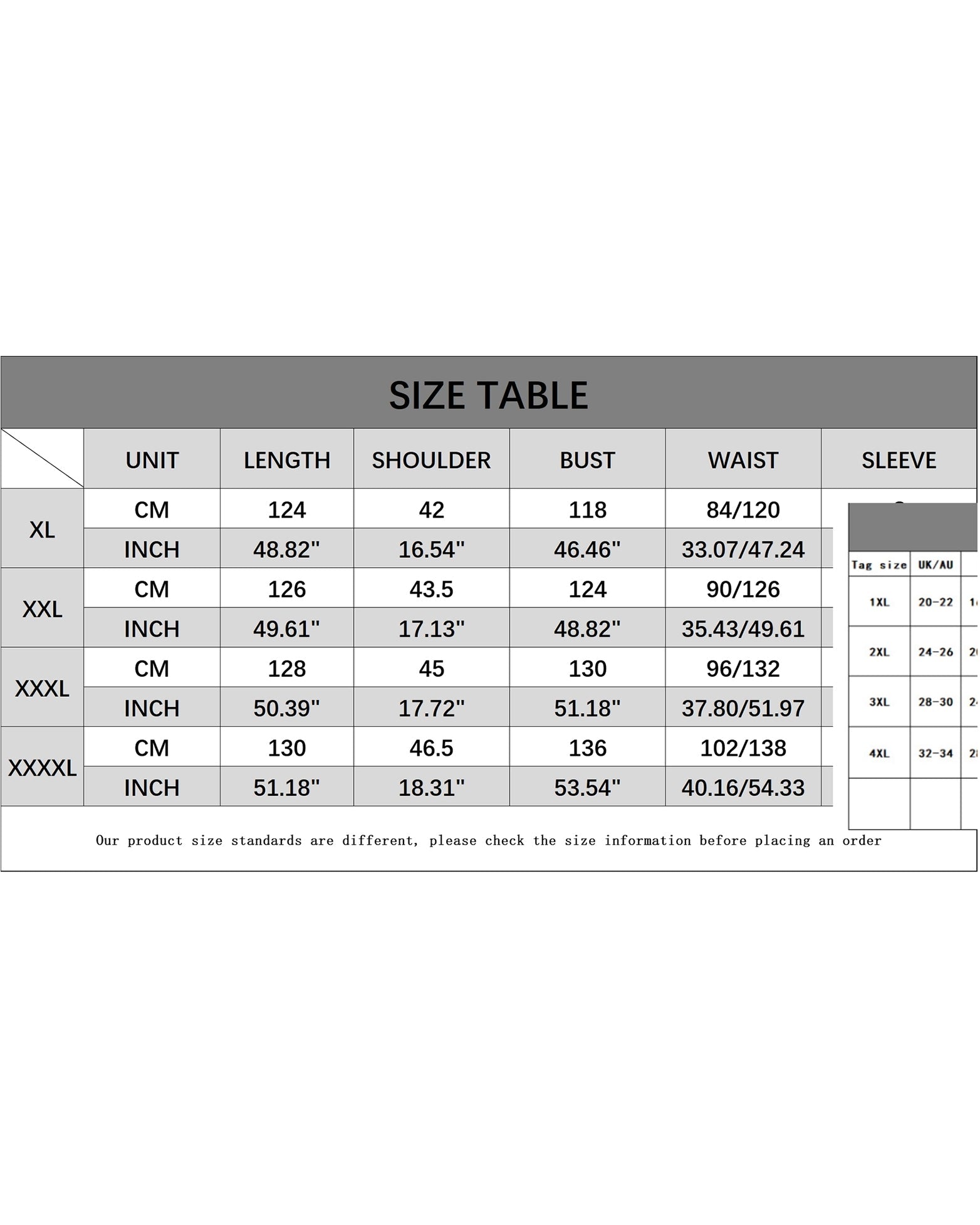 Sizes: XL, XXL, XXXL, 4XL