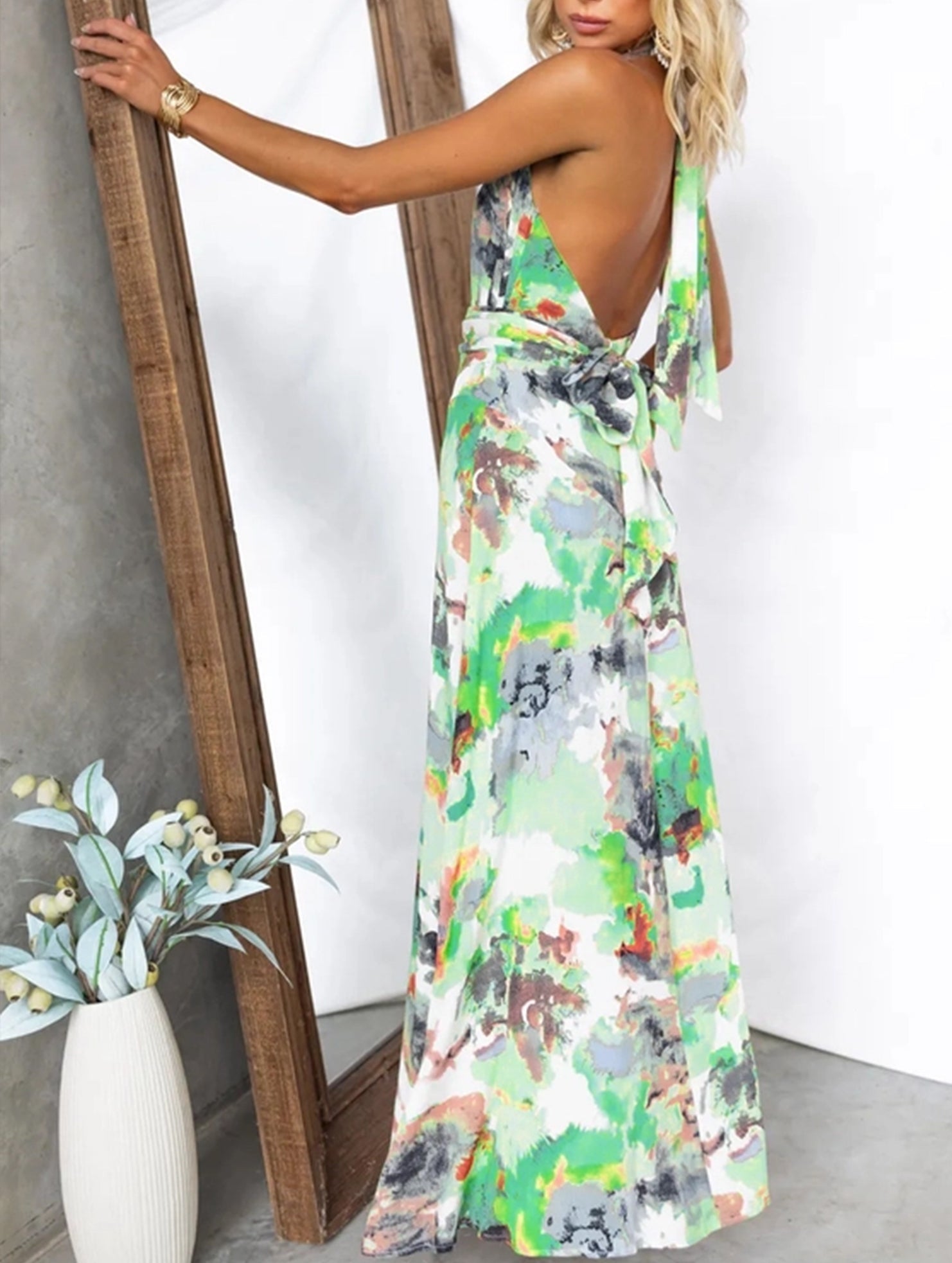 Design: Printed / V-Neck / Lace-Up Waist / A-Line Silhouette