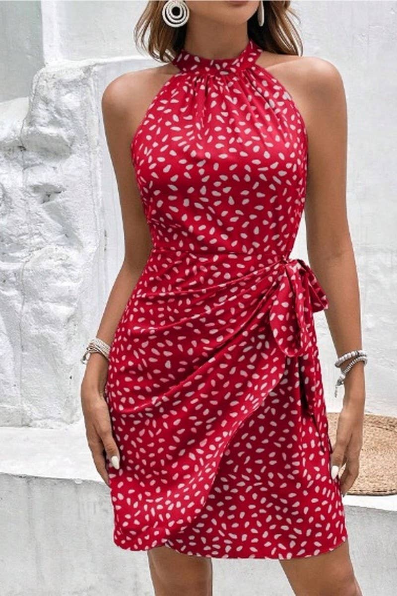 FASHIONABLE HALTERNECK FLORAL PLEATED SHORT DRESS