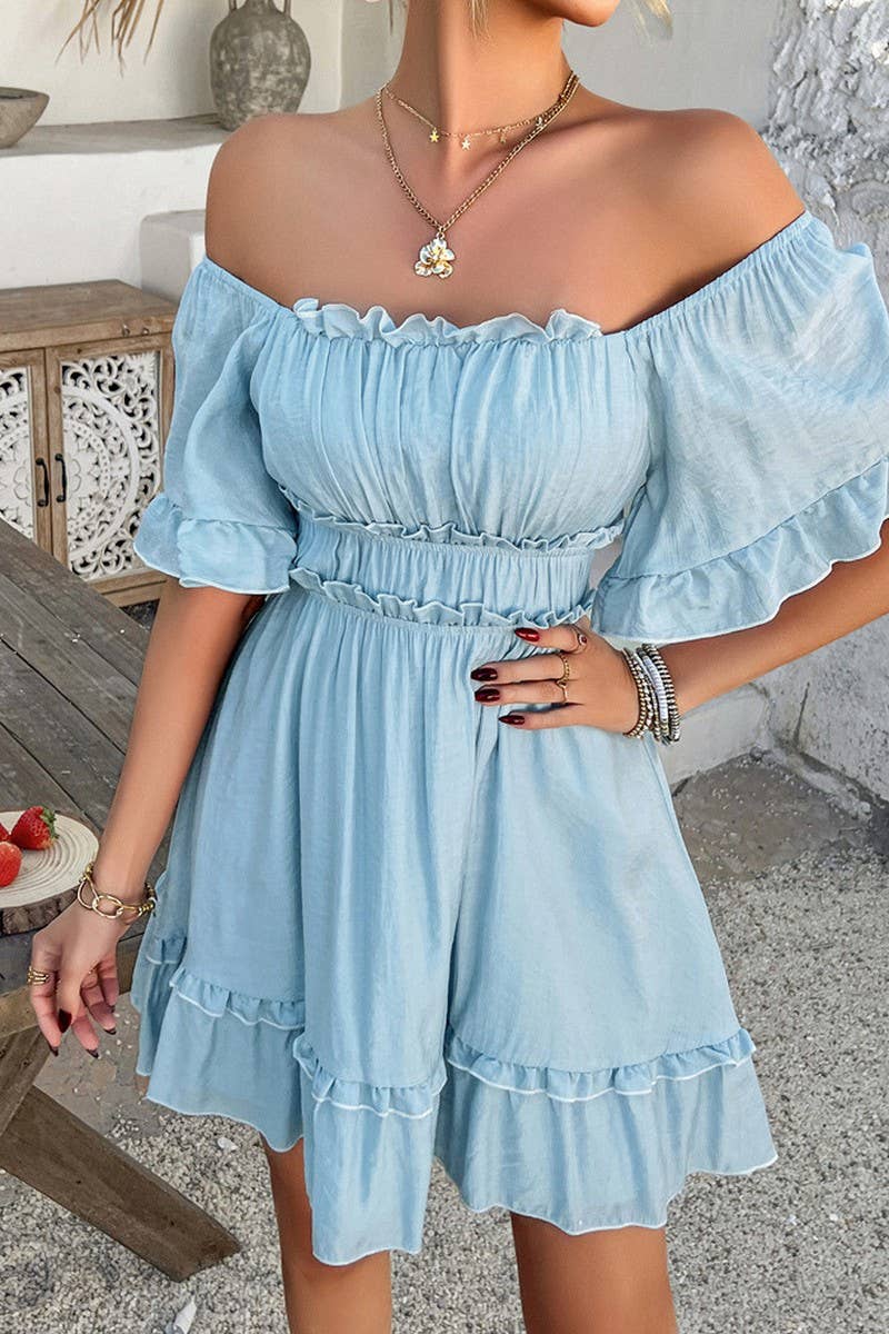 SUMMER SOLID COLOR RUFFLED SHORT-SLEEVED DRESS