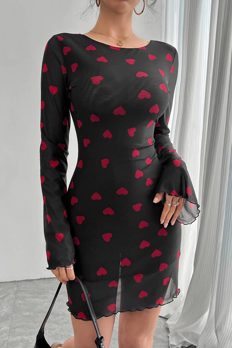 HEART PRINT BELL SLEEVE OPEN BACK MESH DRESS