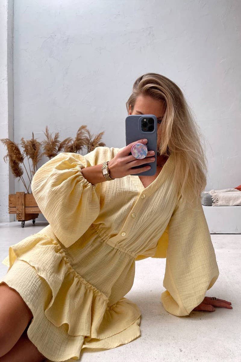 SOLID PUFF SLEEVE ELASTIC WAIST DRESS