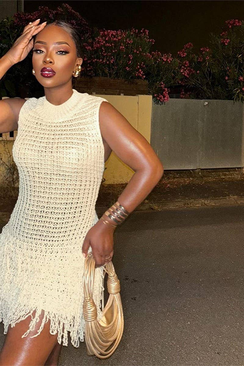 SEXY SLEEVELESS TASSEL HOLLOW SLIM STITCHING DRESS