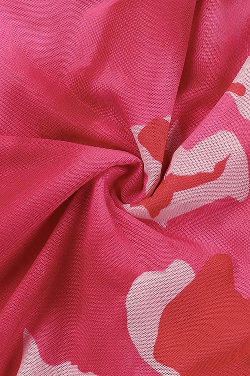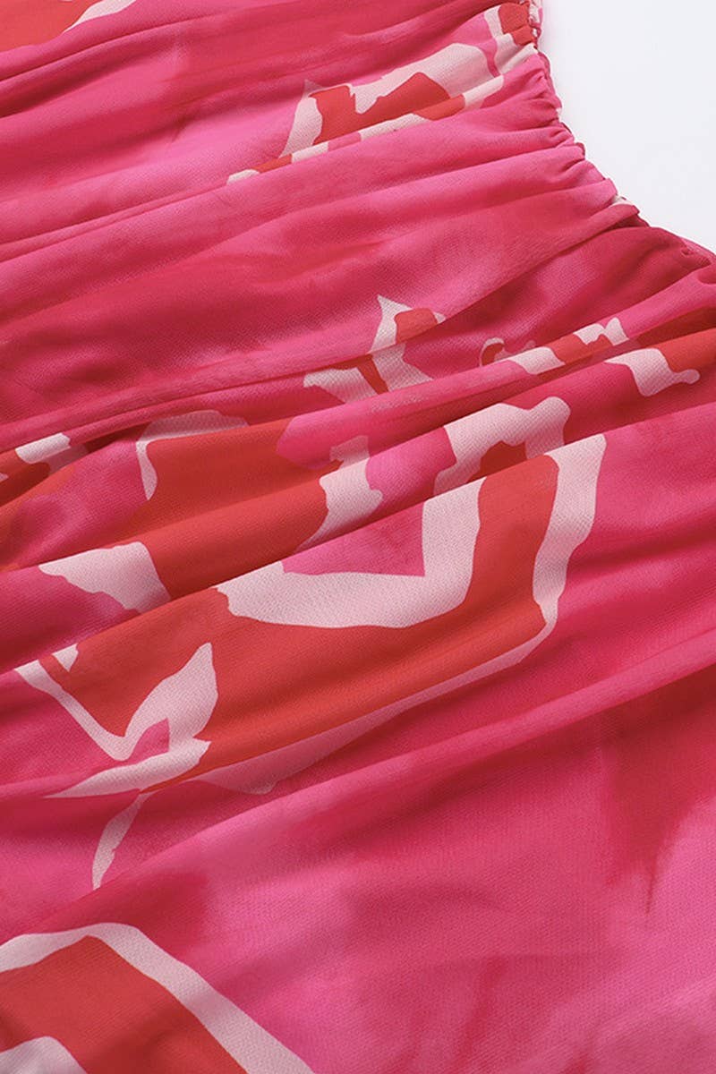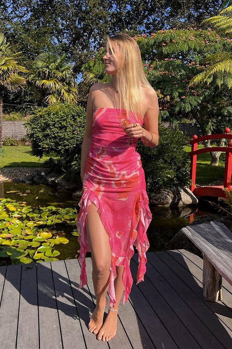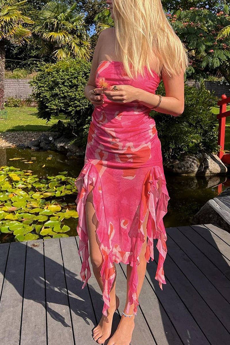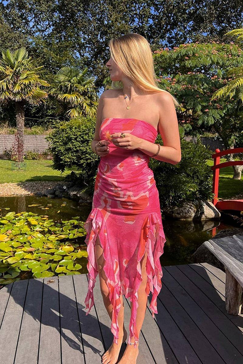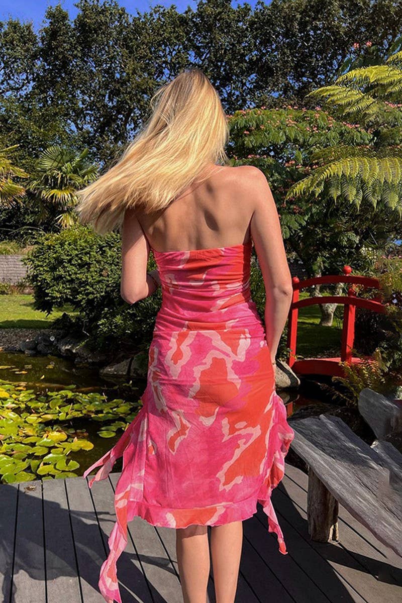 FLORAL MESH STRAPLESS RUFFLE VACATION MINI DRESS