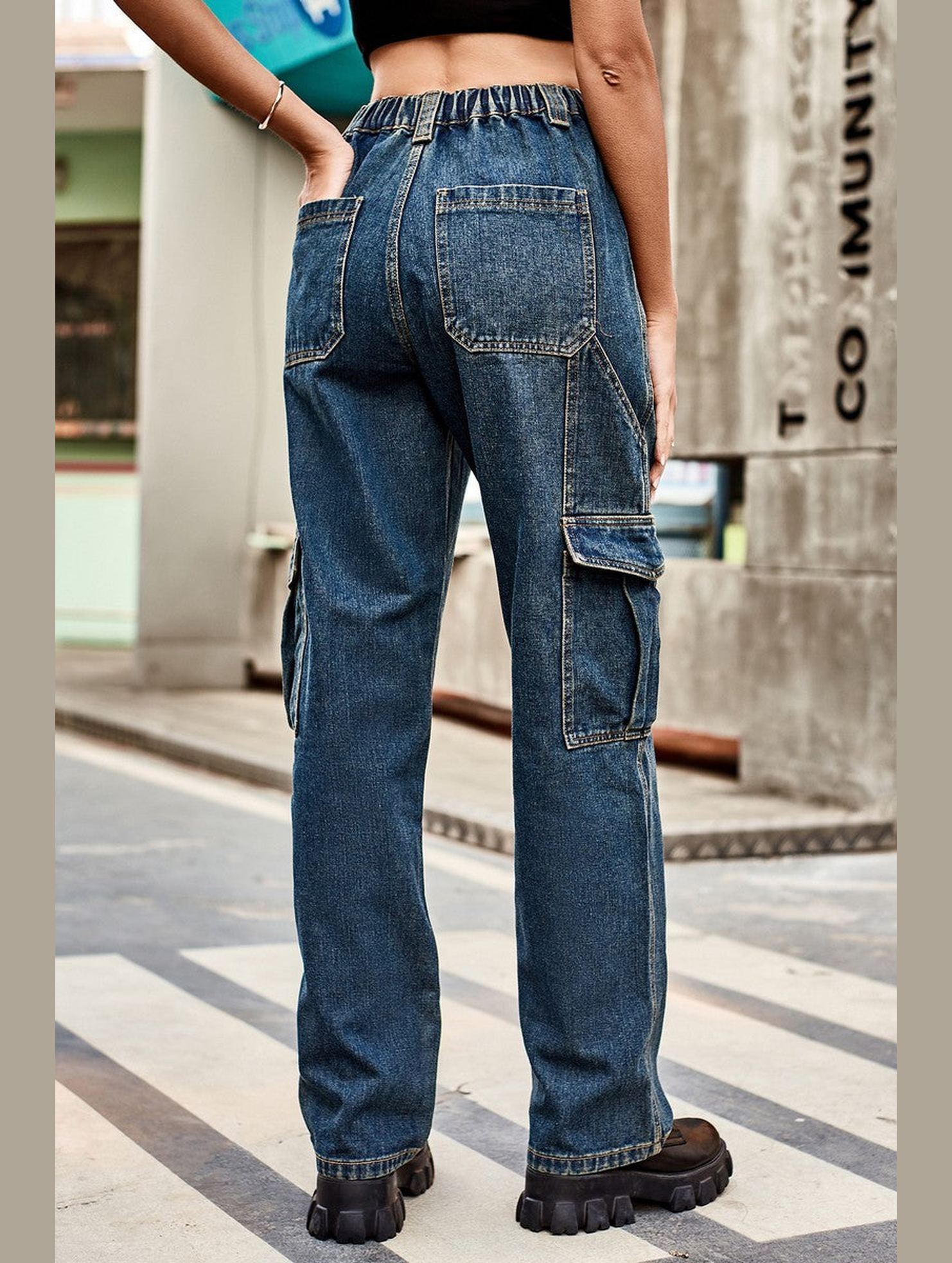 WOMEN COMFY ELASTIC WAIST DENIM CARGO JEANS