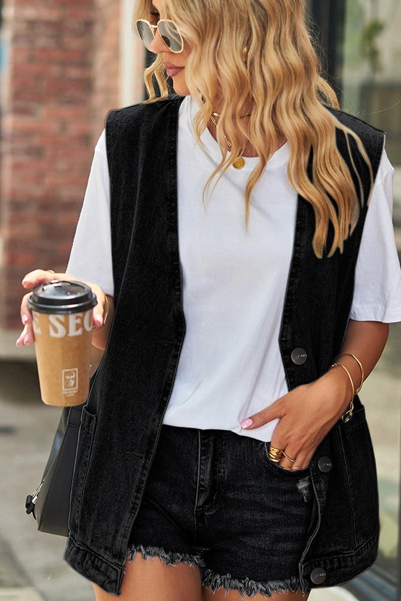 V NECK FADED DENIM BUTTON UP POCKET VEST