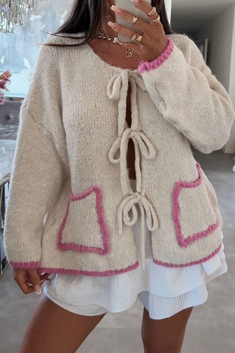 COLORBLOCK BOW TIE LOOSE KNIT CARDIGAN TOP