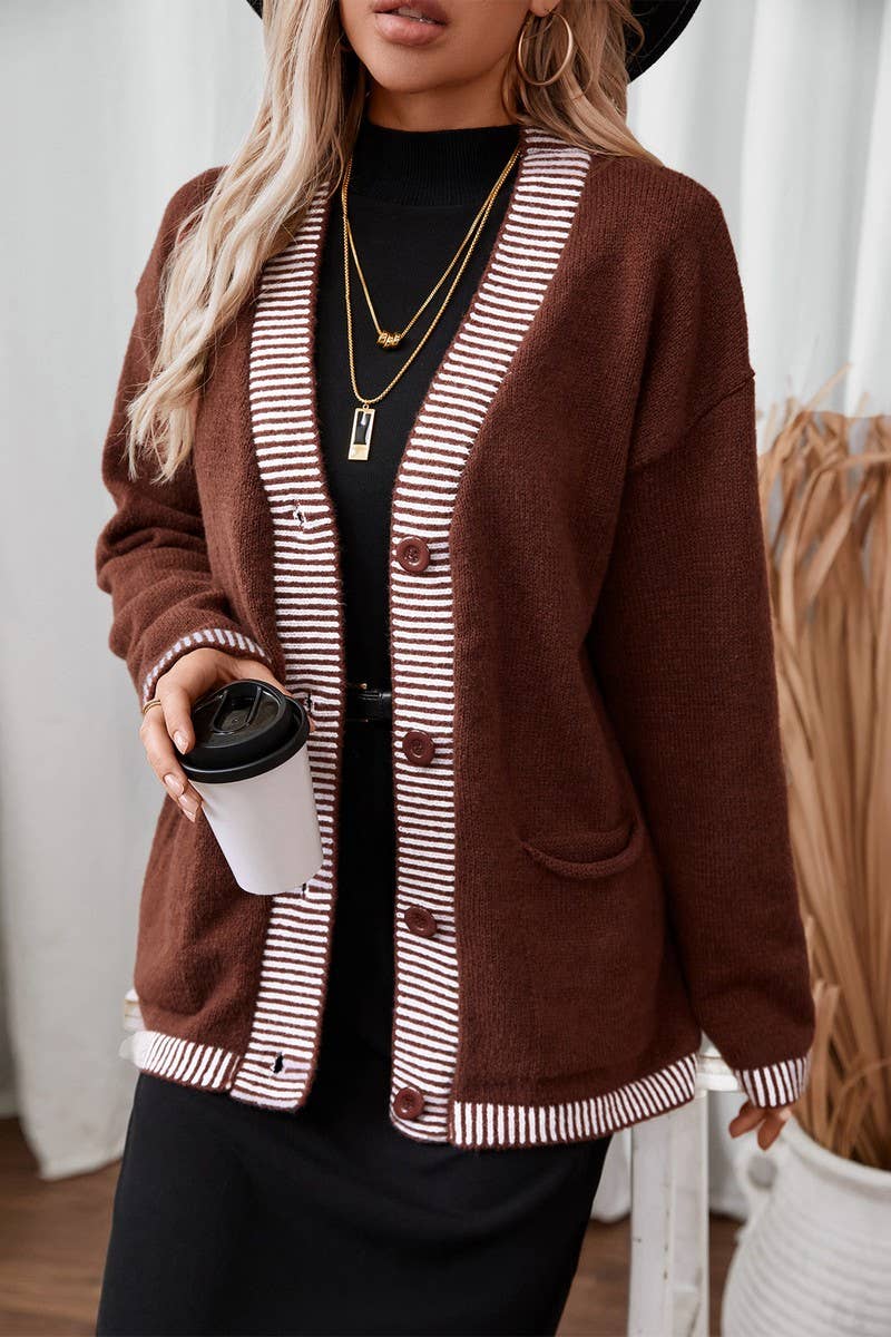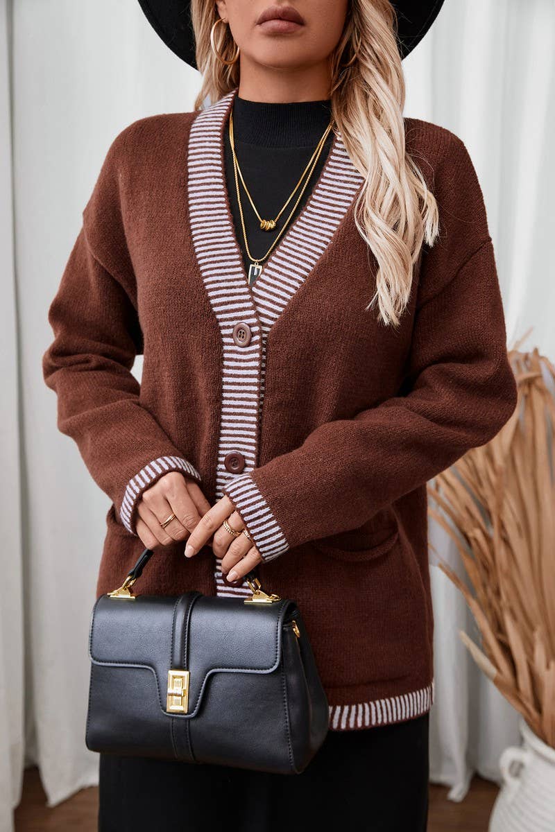 SLOUCHY POCKET SINGLE BREASTED STRIPED KNIT TOP
