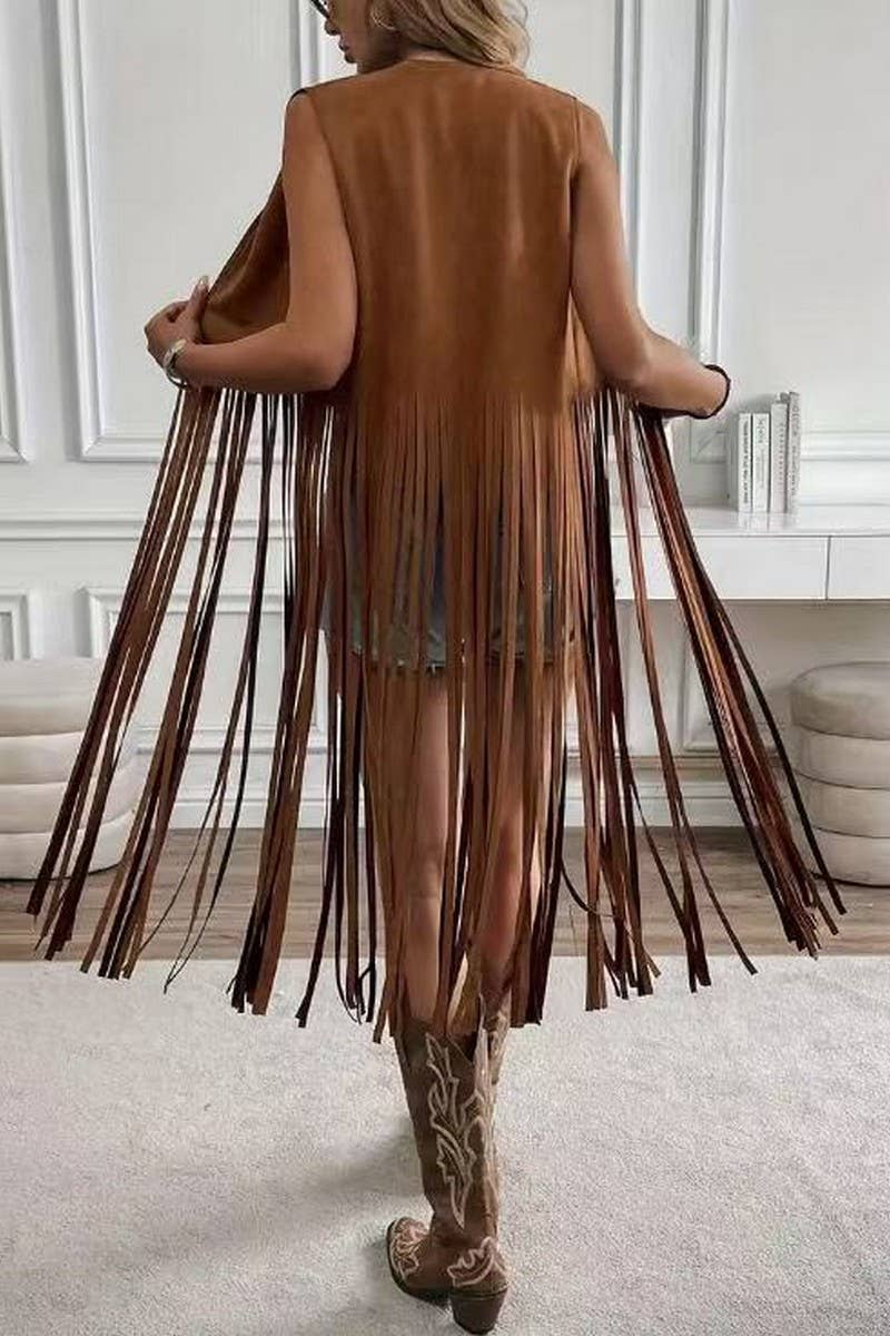 BUTTONLESS FRINGED MID-LENGTH VEST JACKET