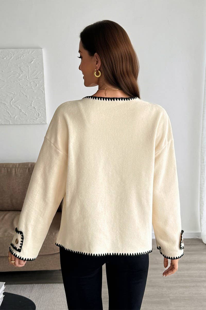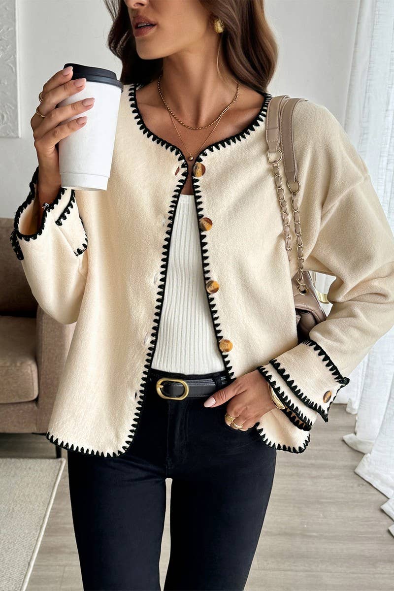 CASUAL CONTRAST-TRIMMED LOOSE CREW NECK JACKET