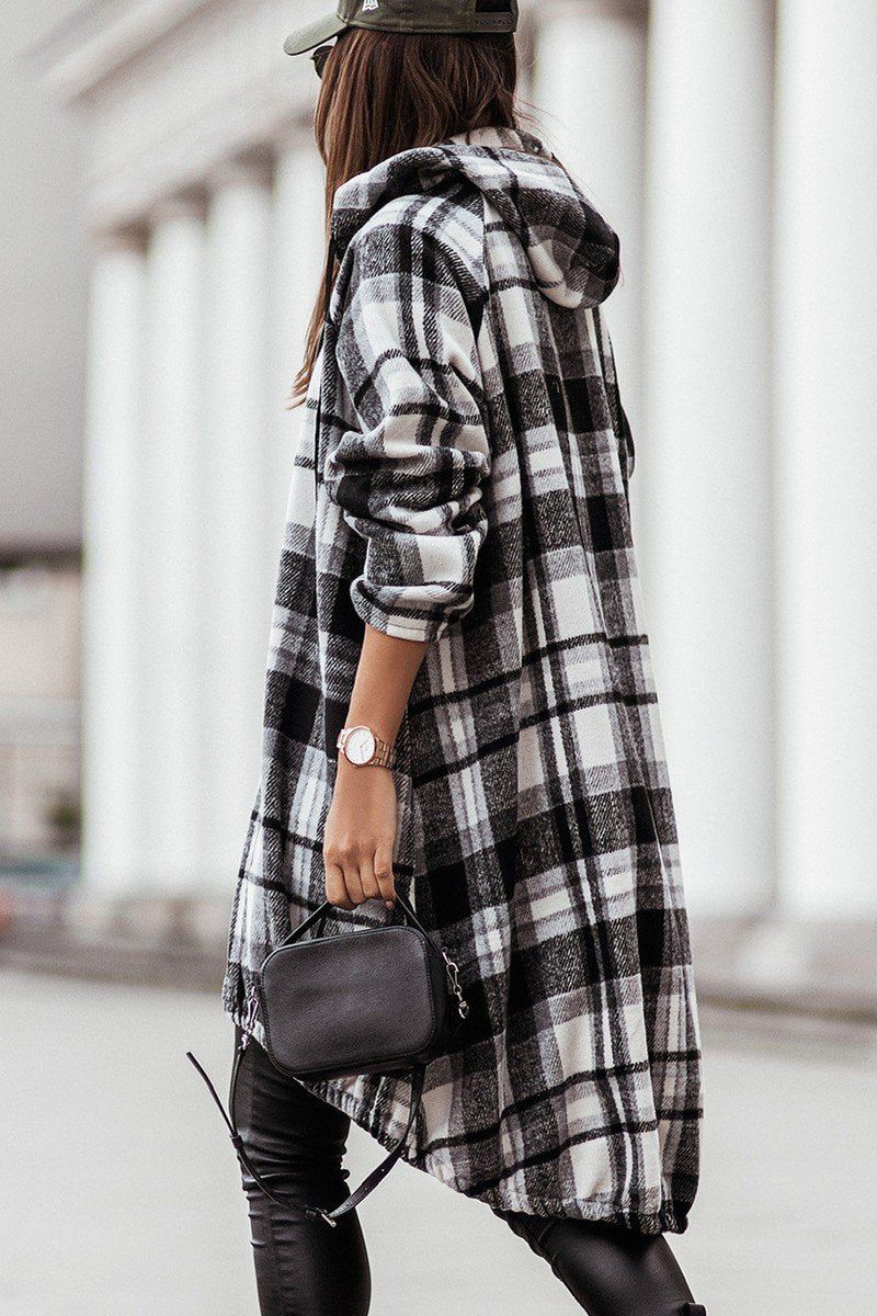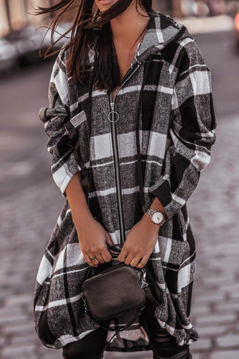 ELASTIC HEM ZIP UP PLAID PATTERN LONG JACKET