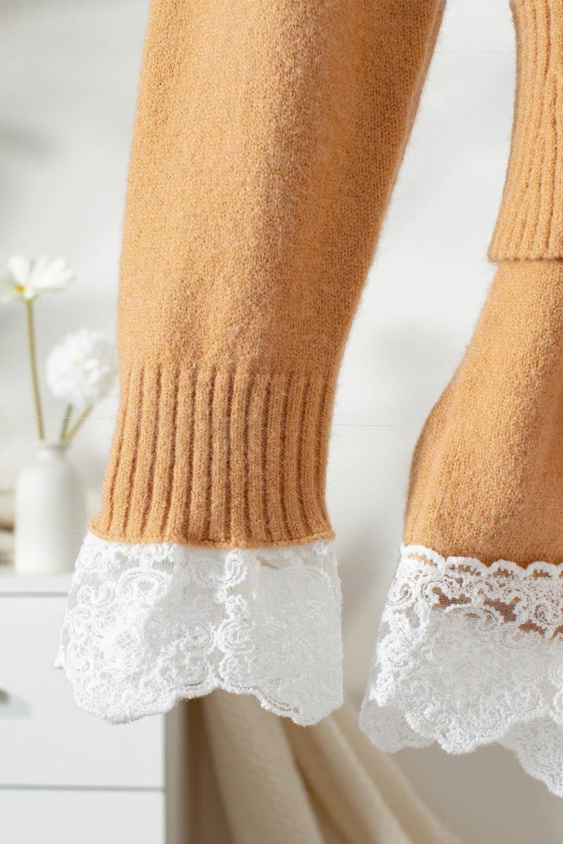 LAPEL LACE PANELED BELTED KNITTED TOP