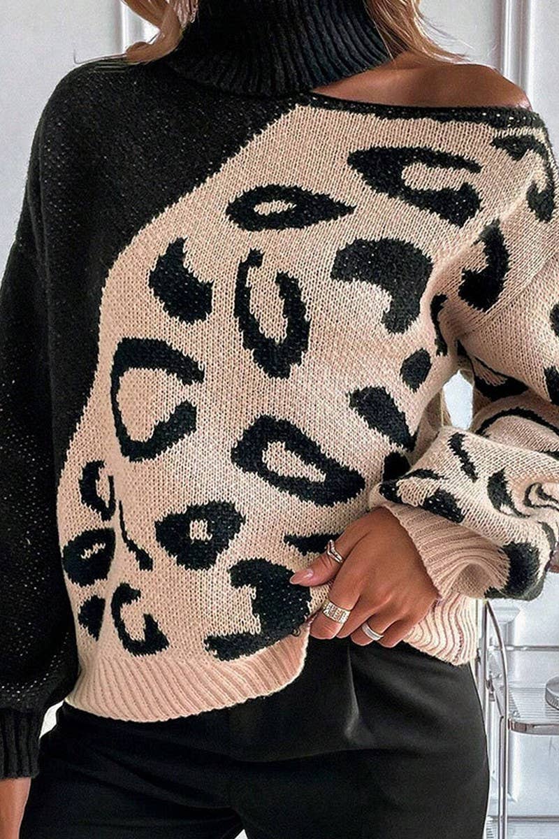 OFF-THE-SHOULDER LEOPARD PRINT TURTLENECK SWEATER