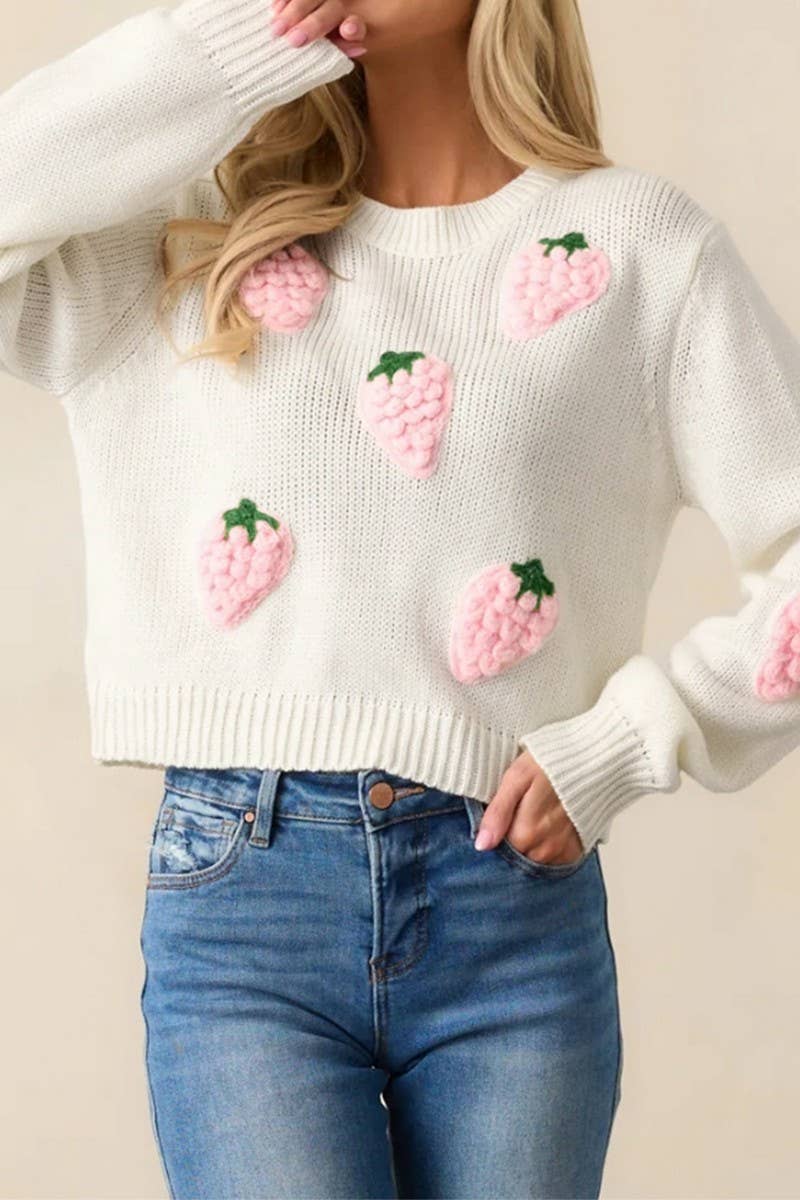 3D STRAWBERRY APPLIQUE ELEGANT PULLOVER SWEATER