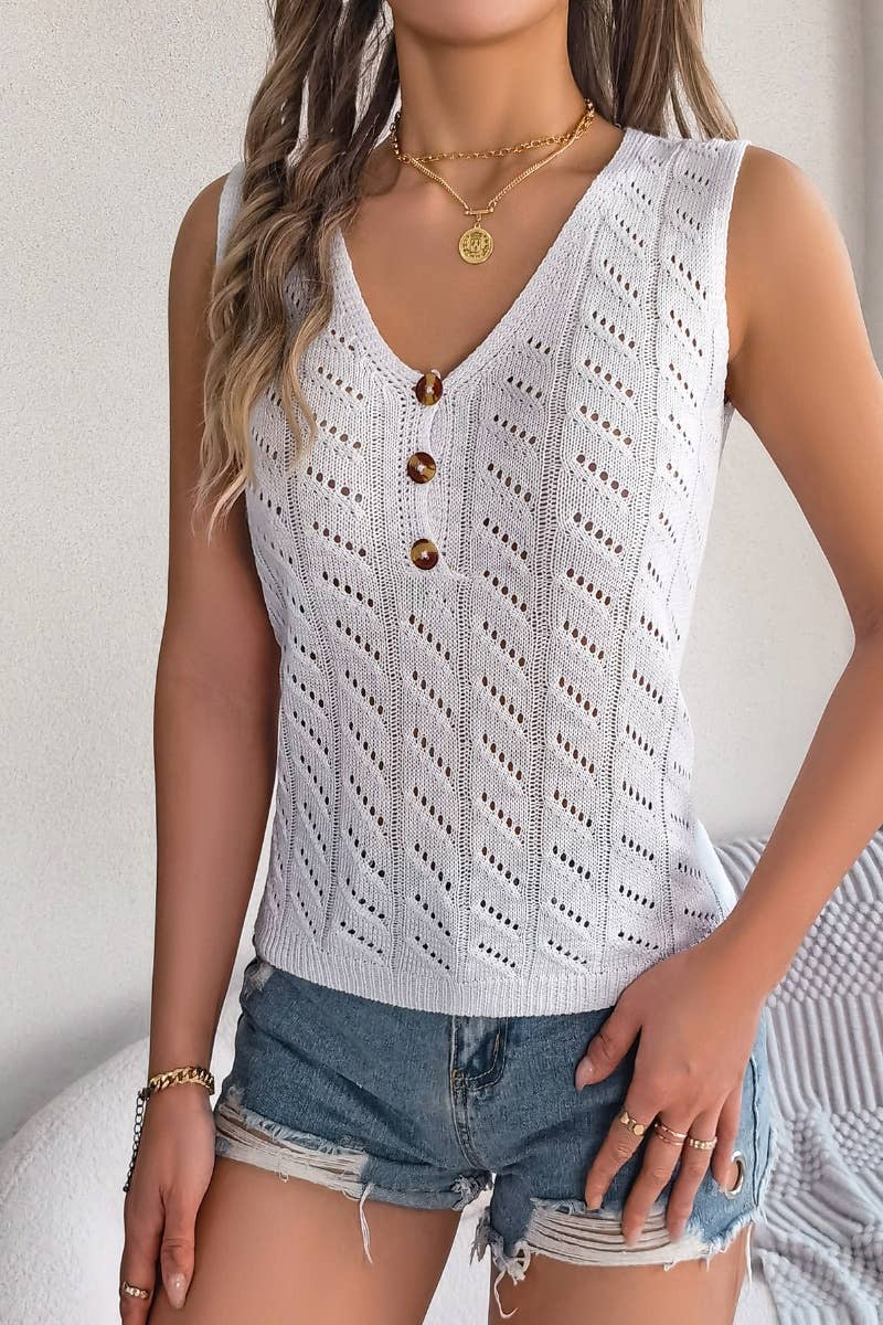 KNIT BUTTON V-NECK HOLLOWED OUT SLEEVELESS TOP