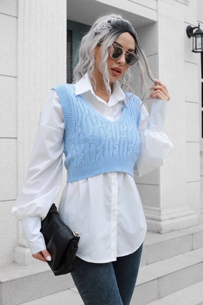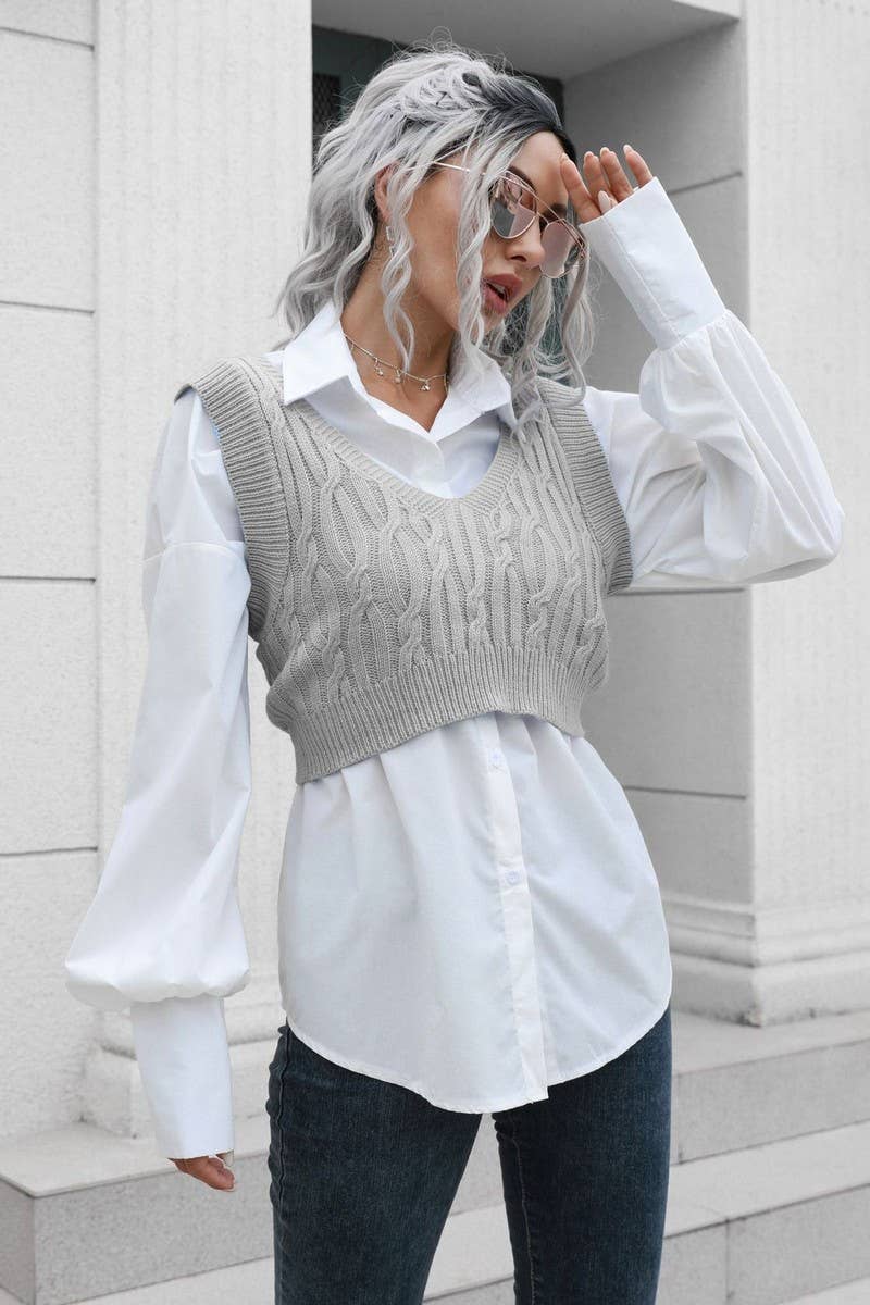CABLE KNIT V-NECK CROPPED VEST SWEATER