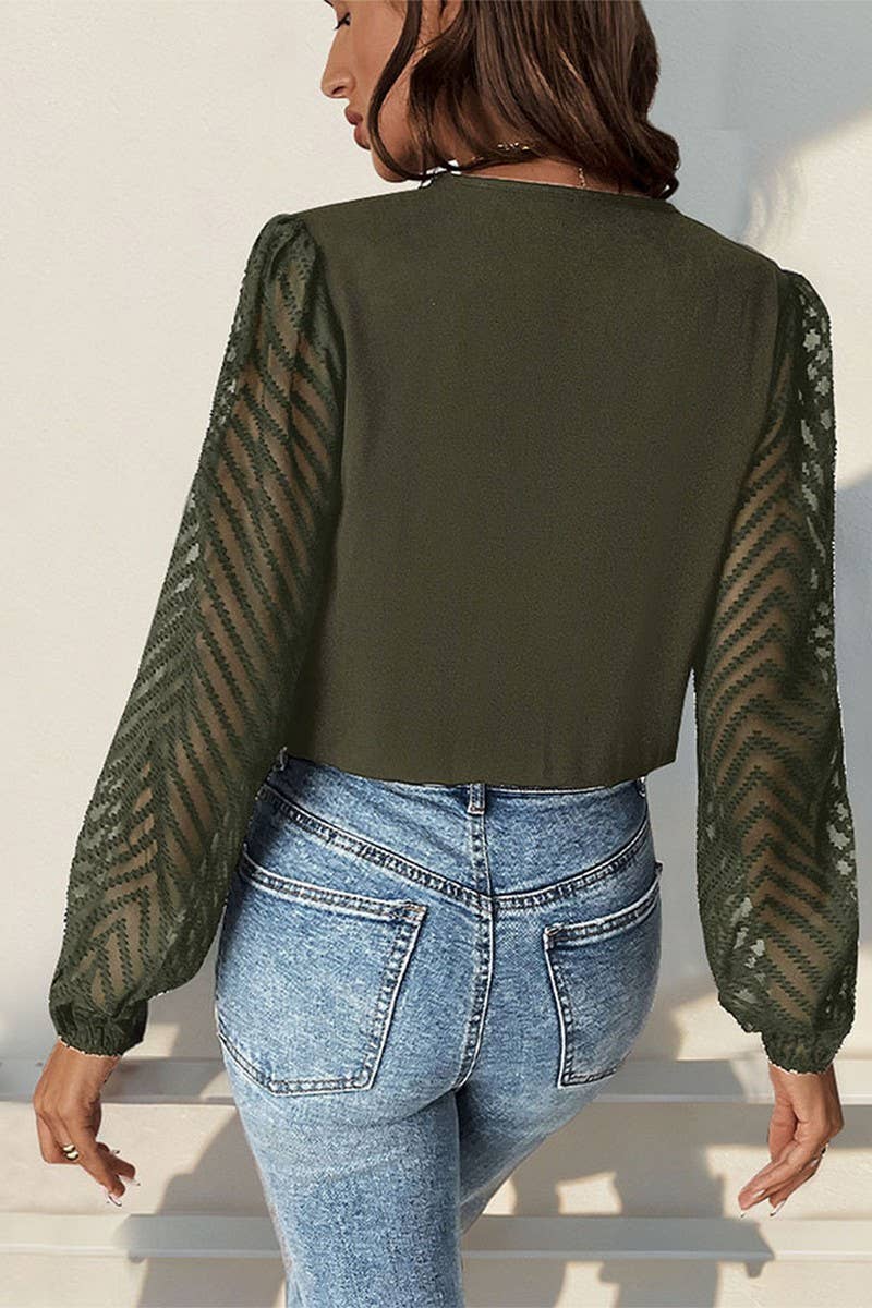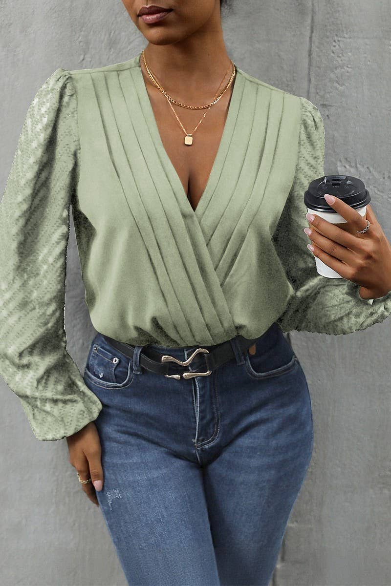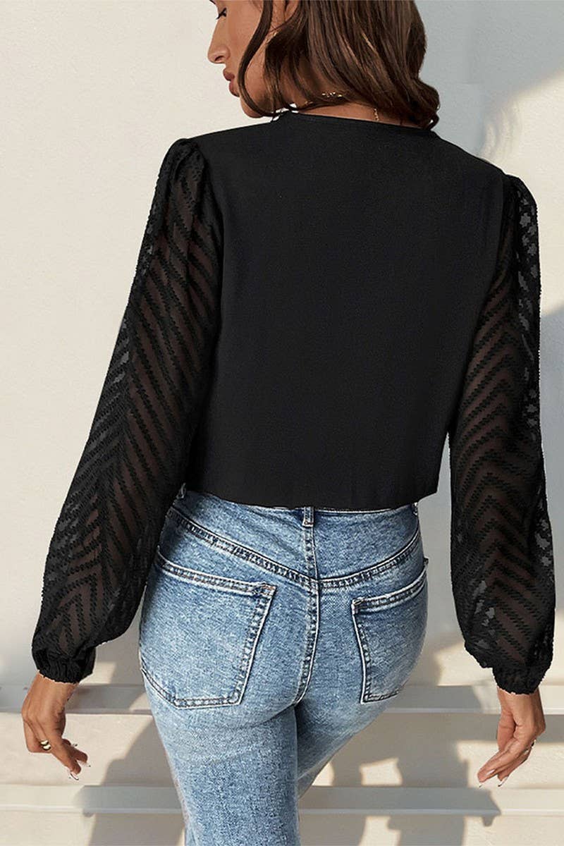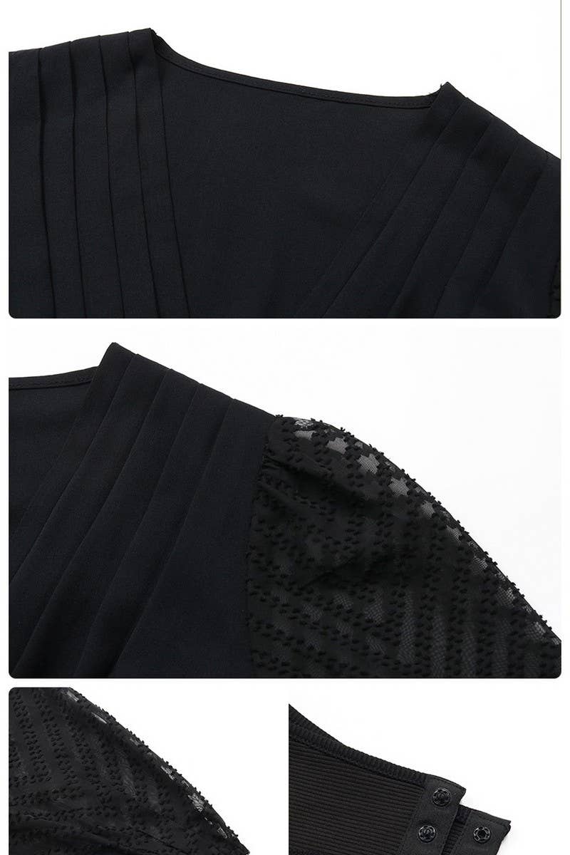 SOLID V-NECK RUFFLE LACE SHEER BODYSUIT 5% ELASTANE, 95% POLYESTER SIZES : S,M,L,XL MADE IN CHINA