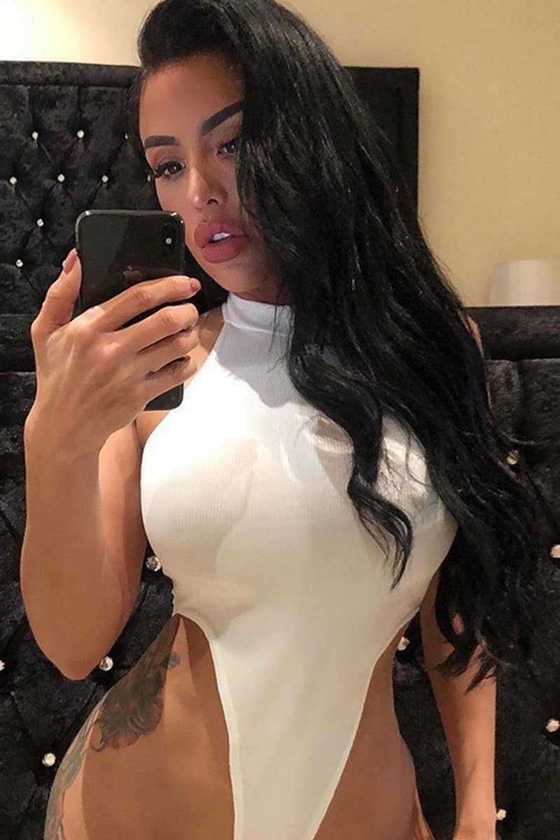 HALTER NECK SLEEVELESS HIGH SLIT BODYSUIT 95% POLYESTER, 5% SPANDEX SIZES : S,M,L MADE IN CHINA