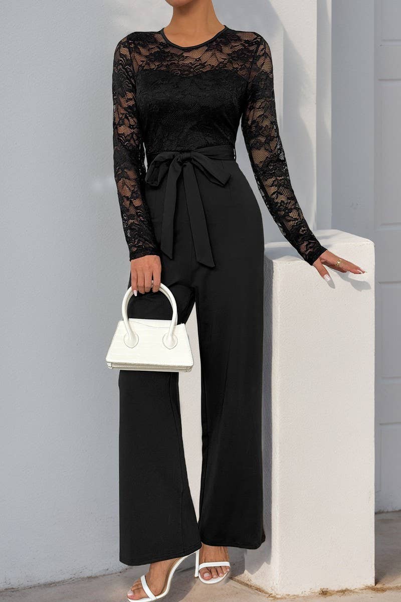 LACE-PANEL ZIPPERED SOLID COLOR JUMPSUIT