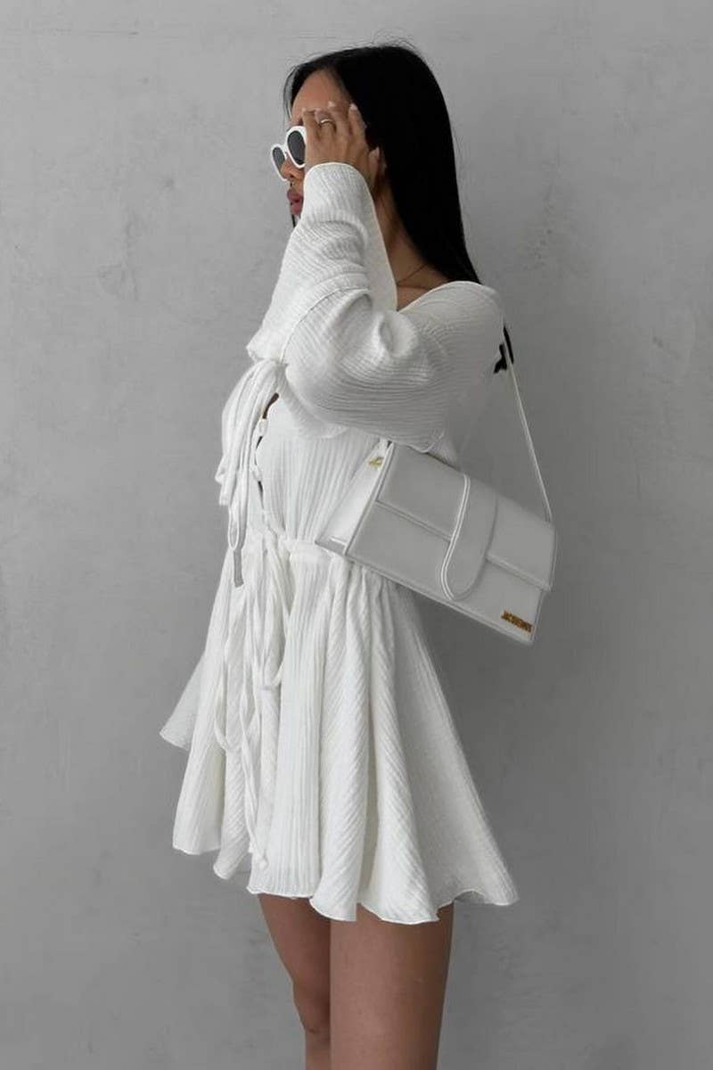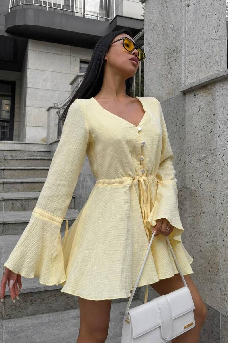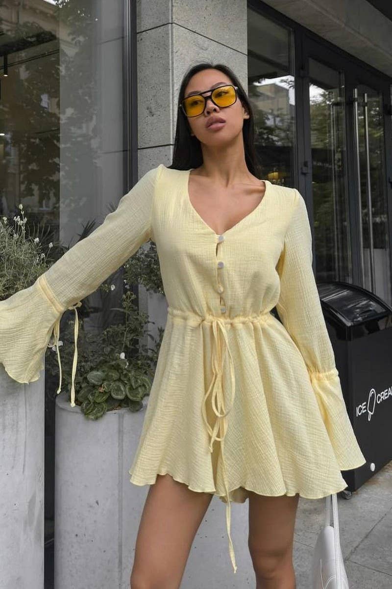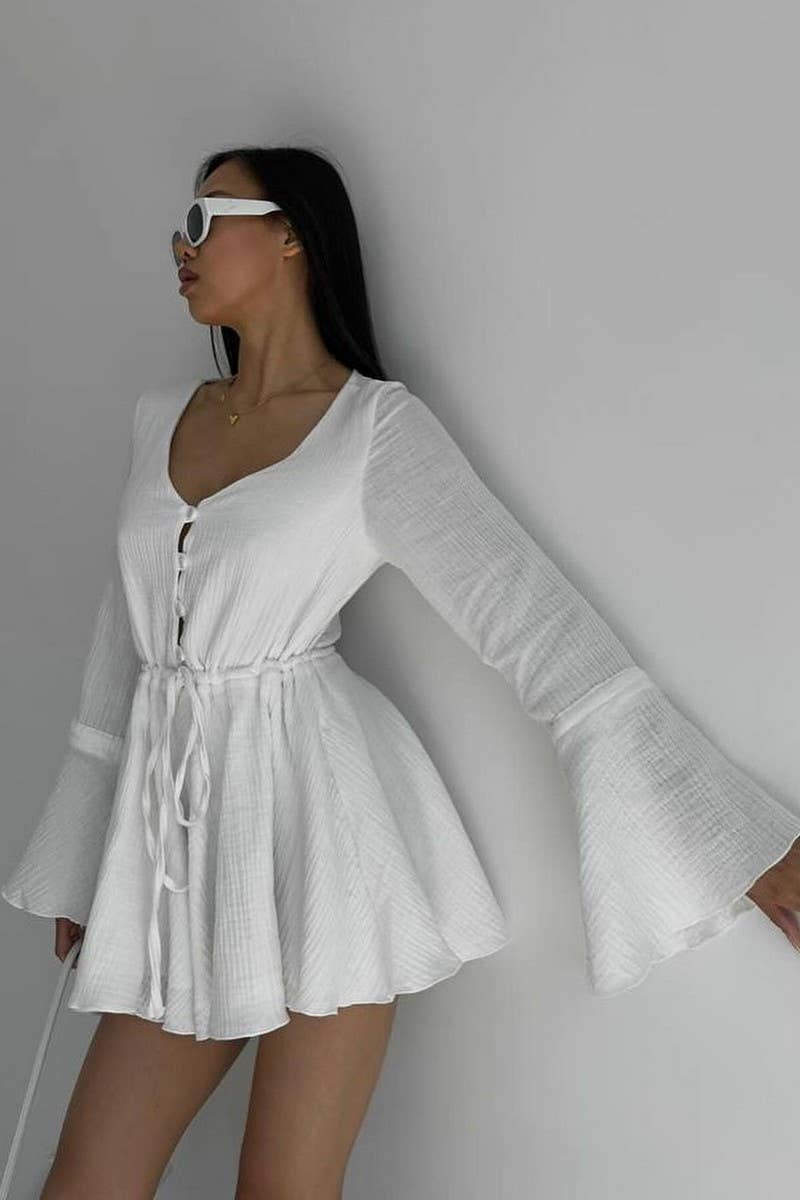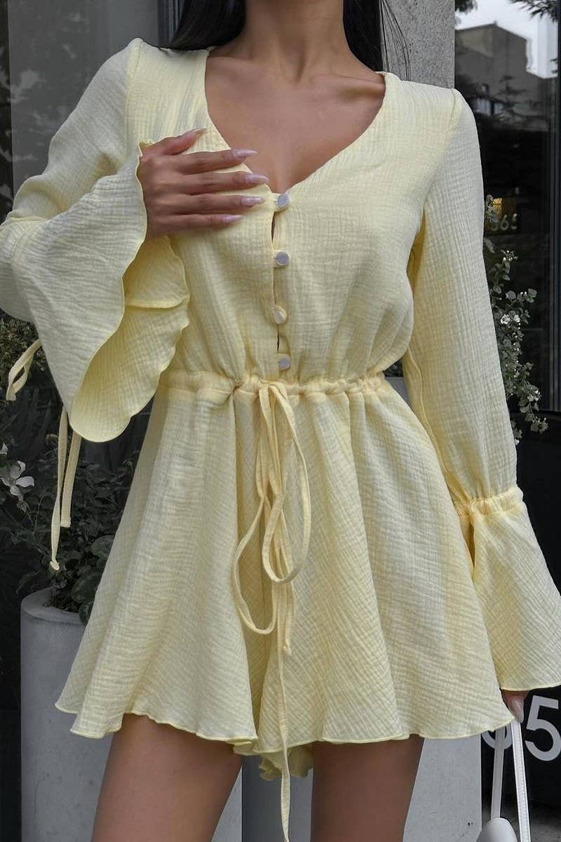 DRAWSTRING TRUMPET SLEEVES V-NECK JUMPSUIT