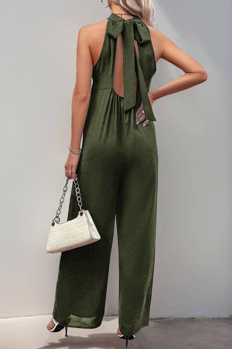 SOLID HIGH NECK HALTER WIDE LEG JUMPSUIT