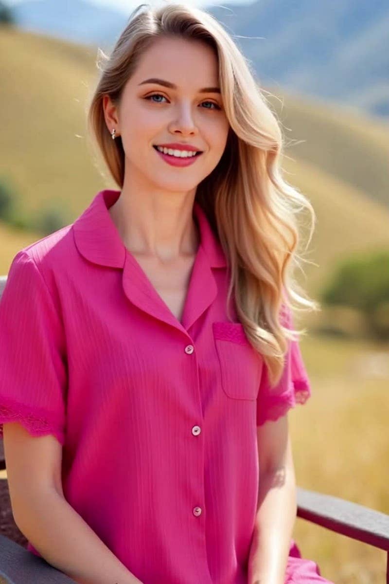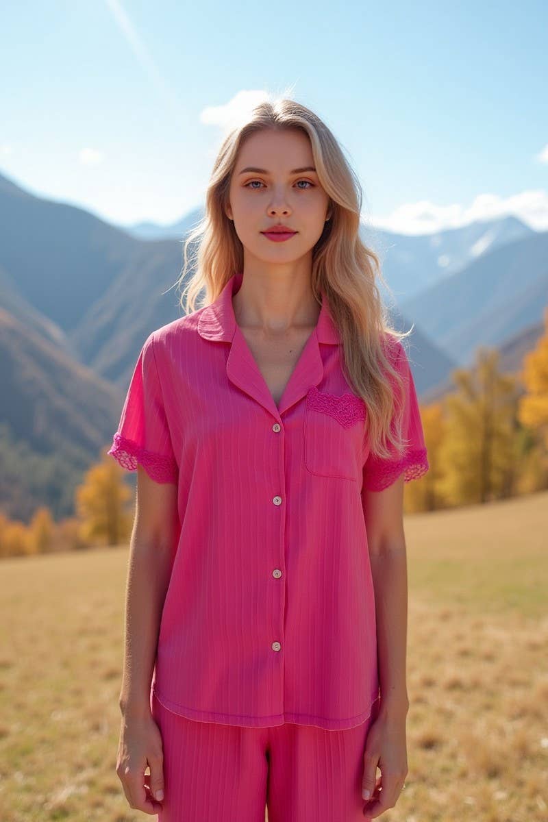 WAVY STRIPE LACE TRIM SHORT SLEEVES PAJAMA SET