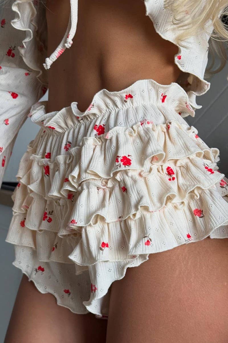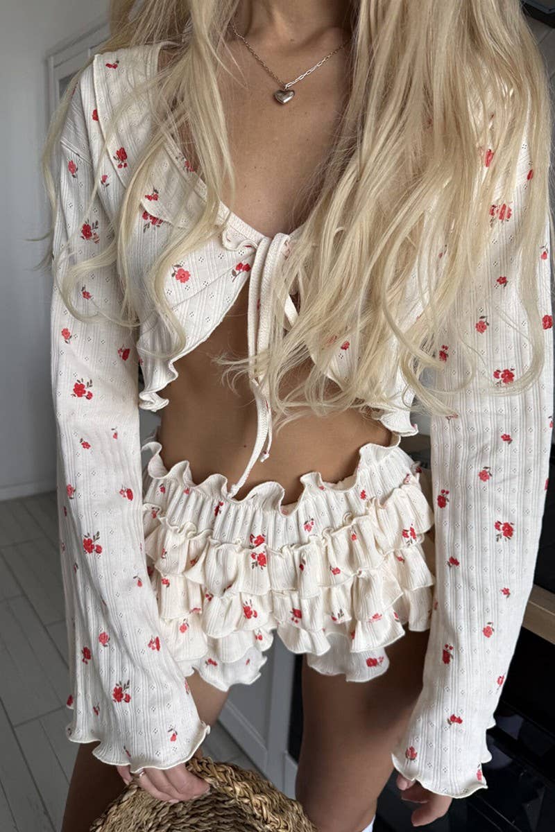 KNITTED PRINTED RUFFLED BREATHABLE PAJAMA SET
