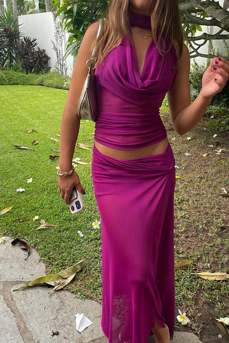 ELEGANT HALTER MESH TOP AND SKIRT SET