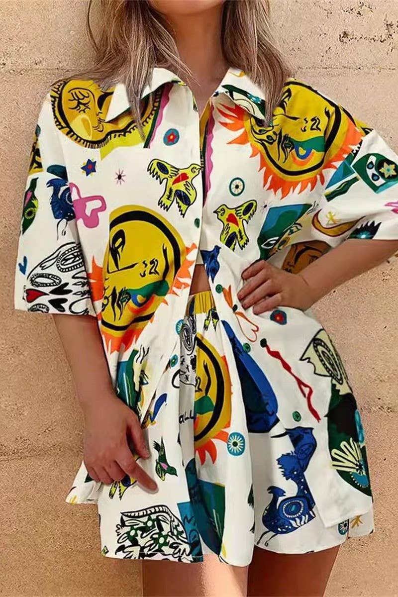 CONTRAST COLOR CASUAL GRAFFITI PRINT TWO-PIECE