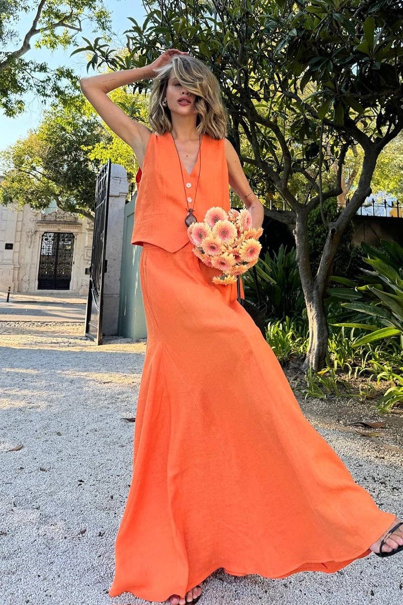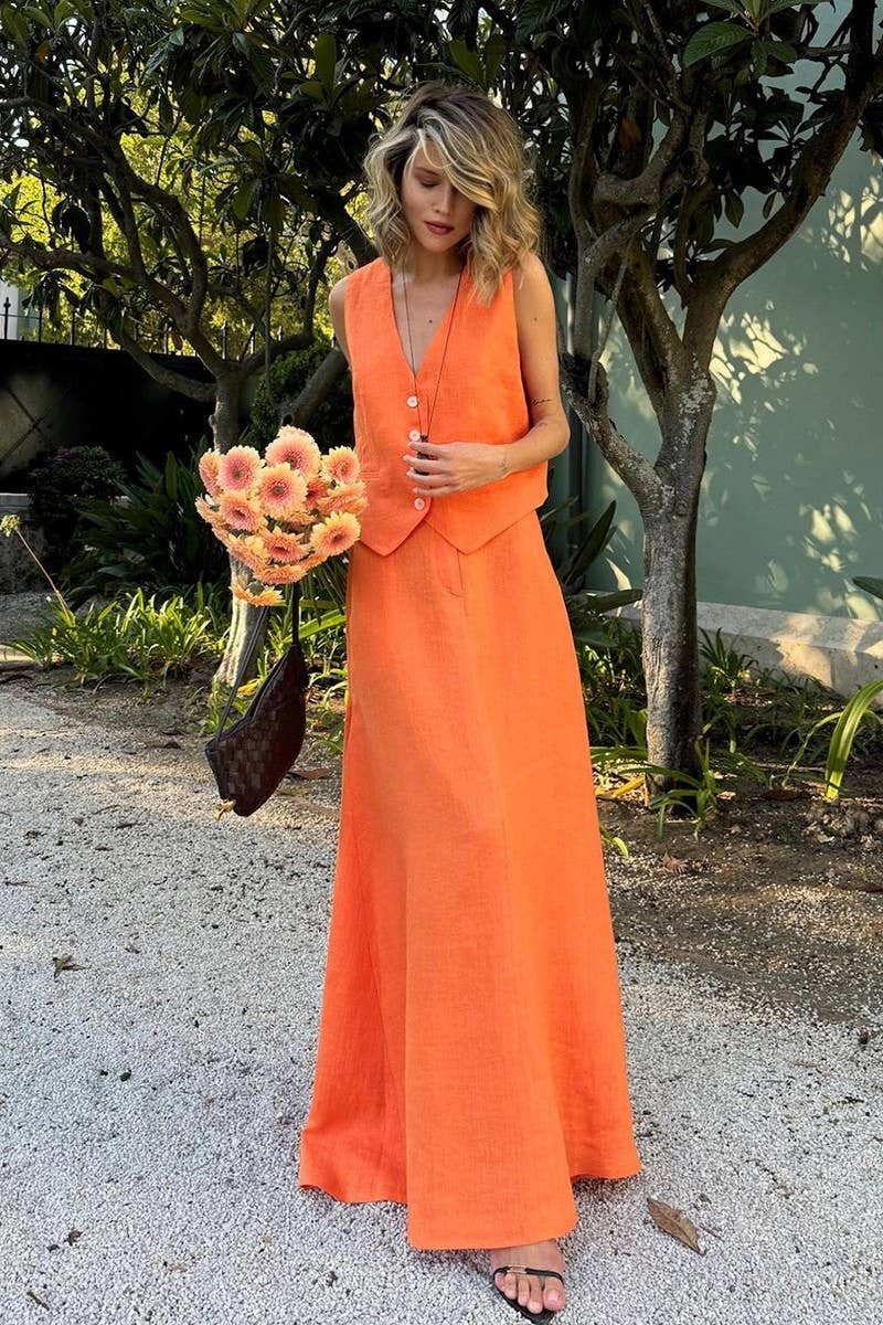 SOLID LINEN VEST AND LONG A-LINE SKIRT SET
