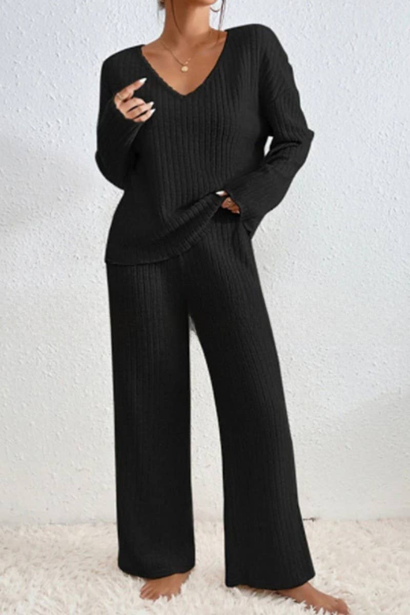 V-NECK CASUAL RIBBED BRUSHED LONG-SLEEVED SUIT