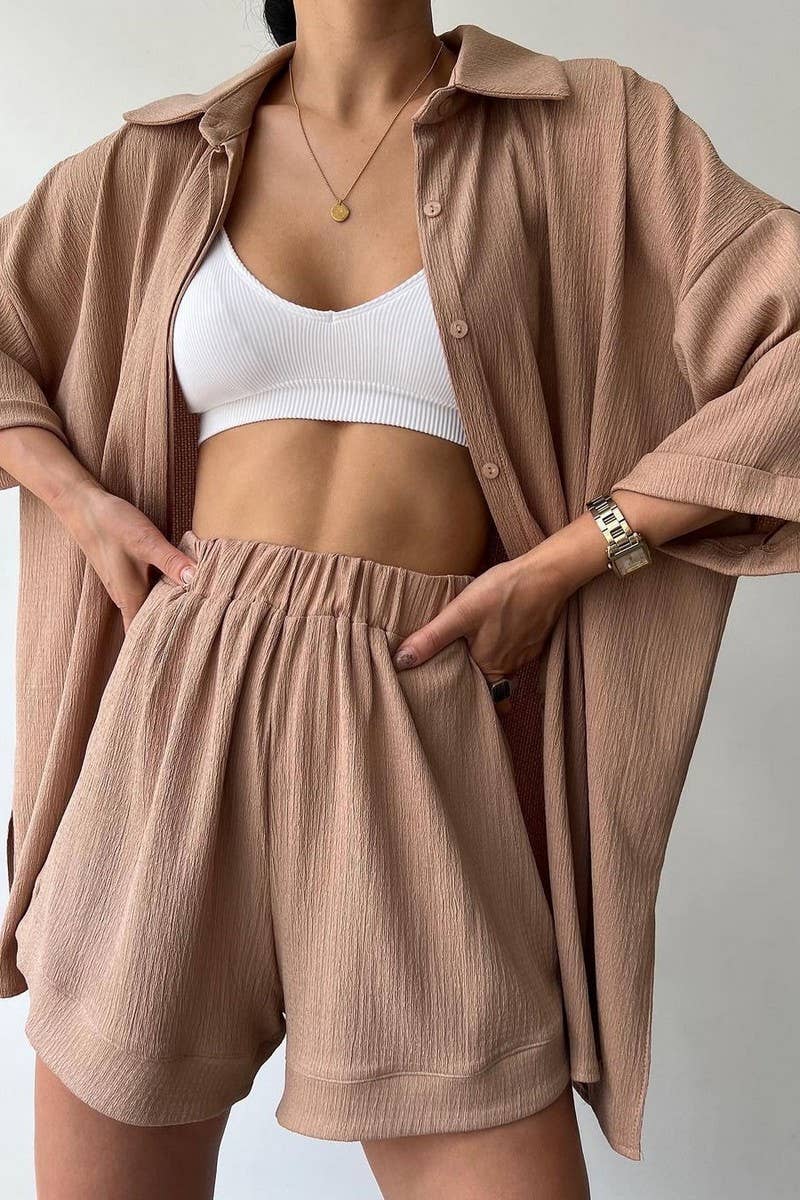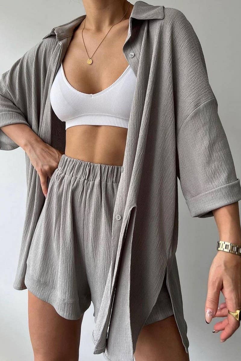 SOLID COLOR SLIT MID-SLEEVE SHIRT AND SHORTS SET