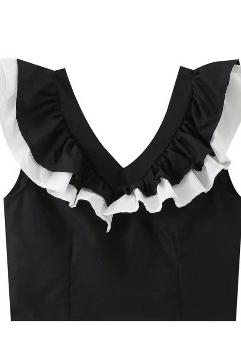V-NECK SHORT-SLEEVED RUFFLED LONG SKIRT SUIT