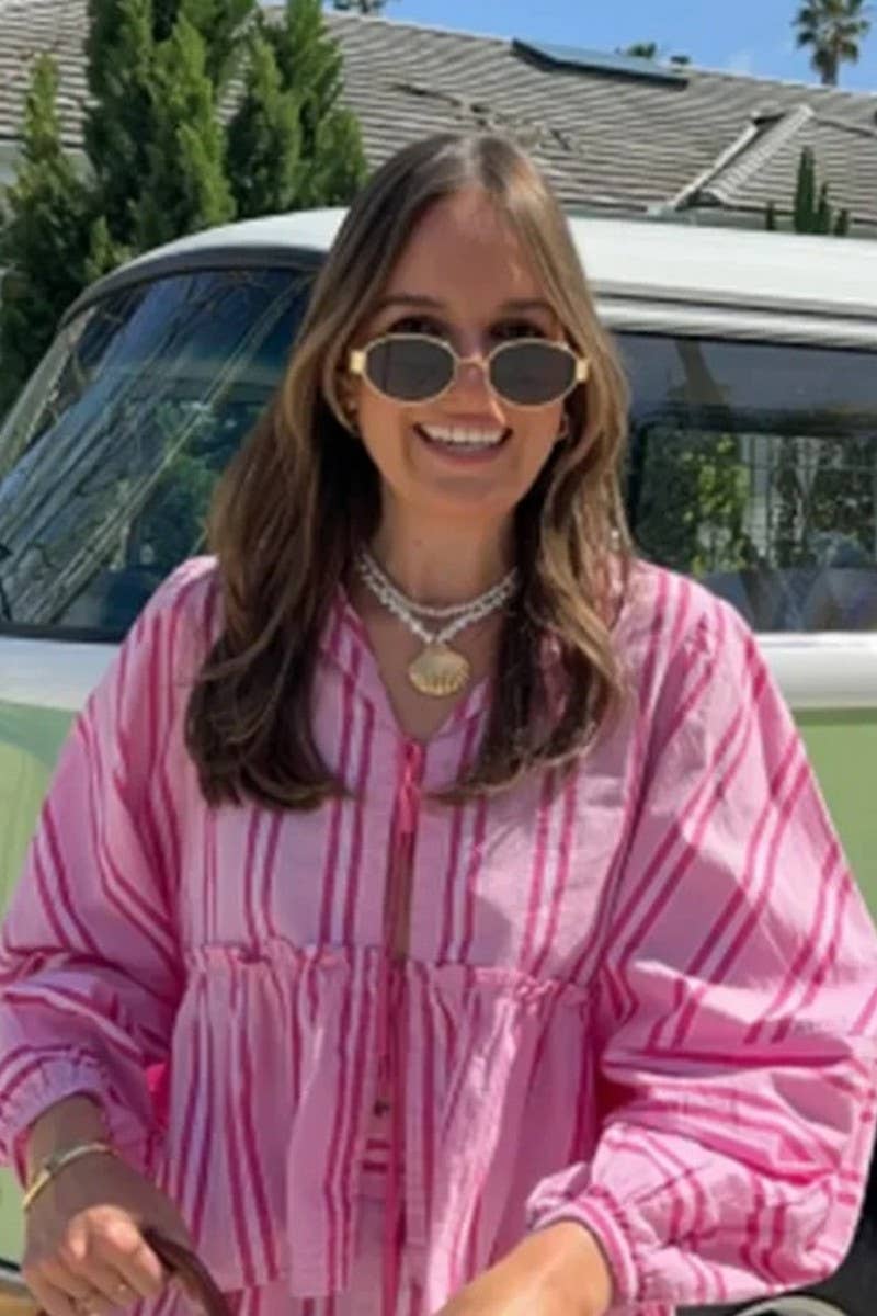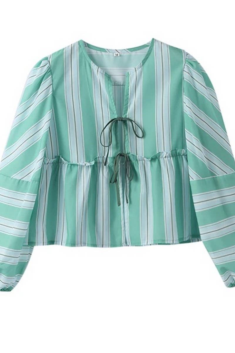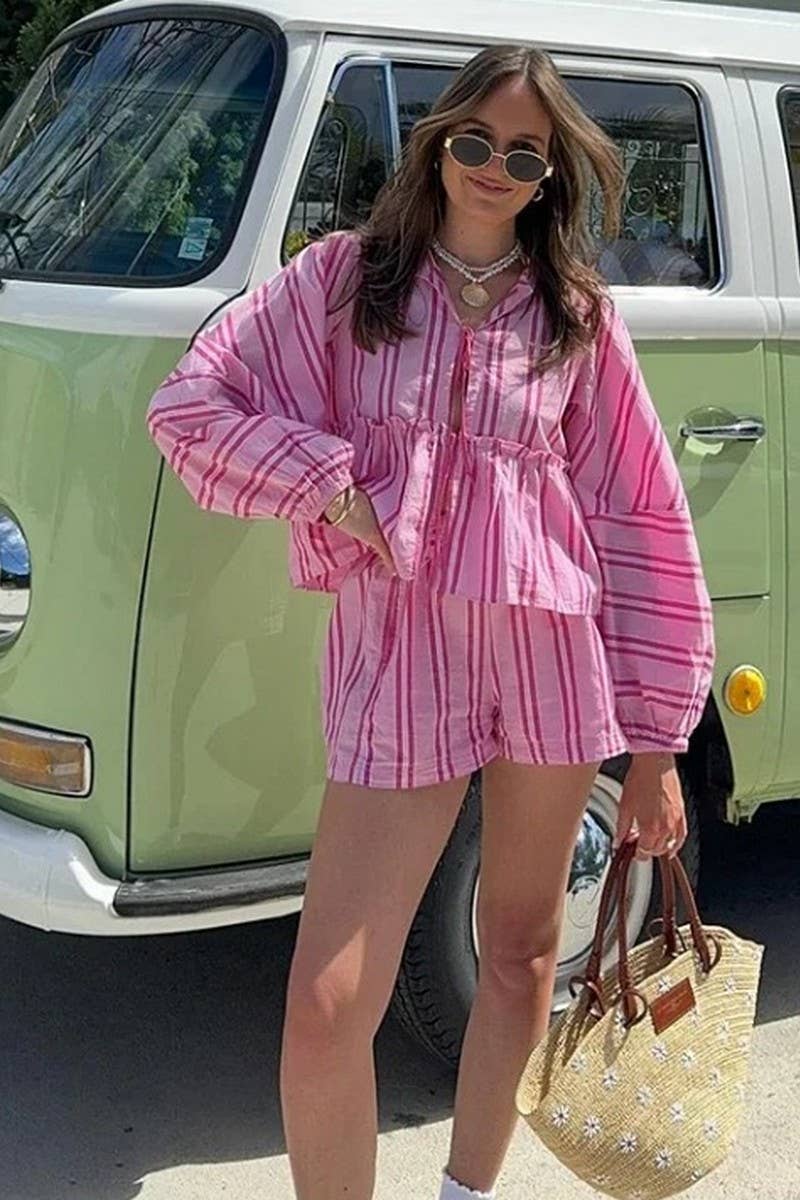 STRIPED LACE-UP BALLOON SLEEVE SHORTS SET