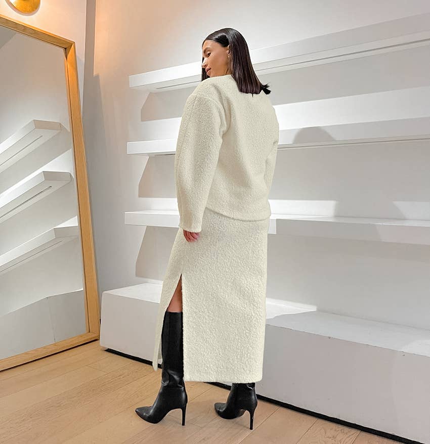 CWSTB1404_LAMB FLEECE HOODIE HIGH WAIST SPLIT SKIRT SET