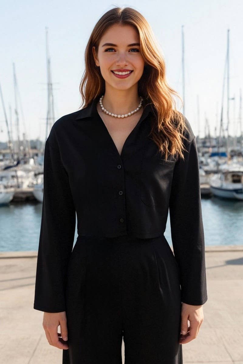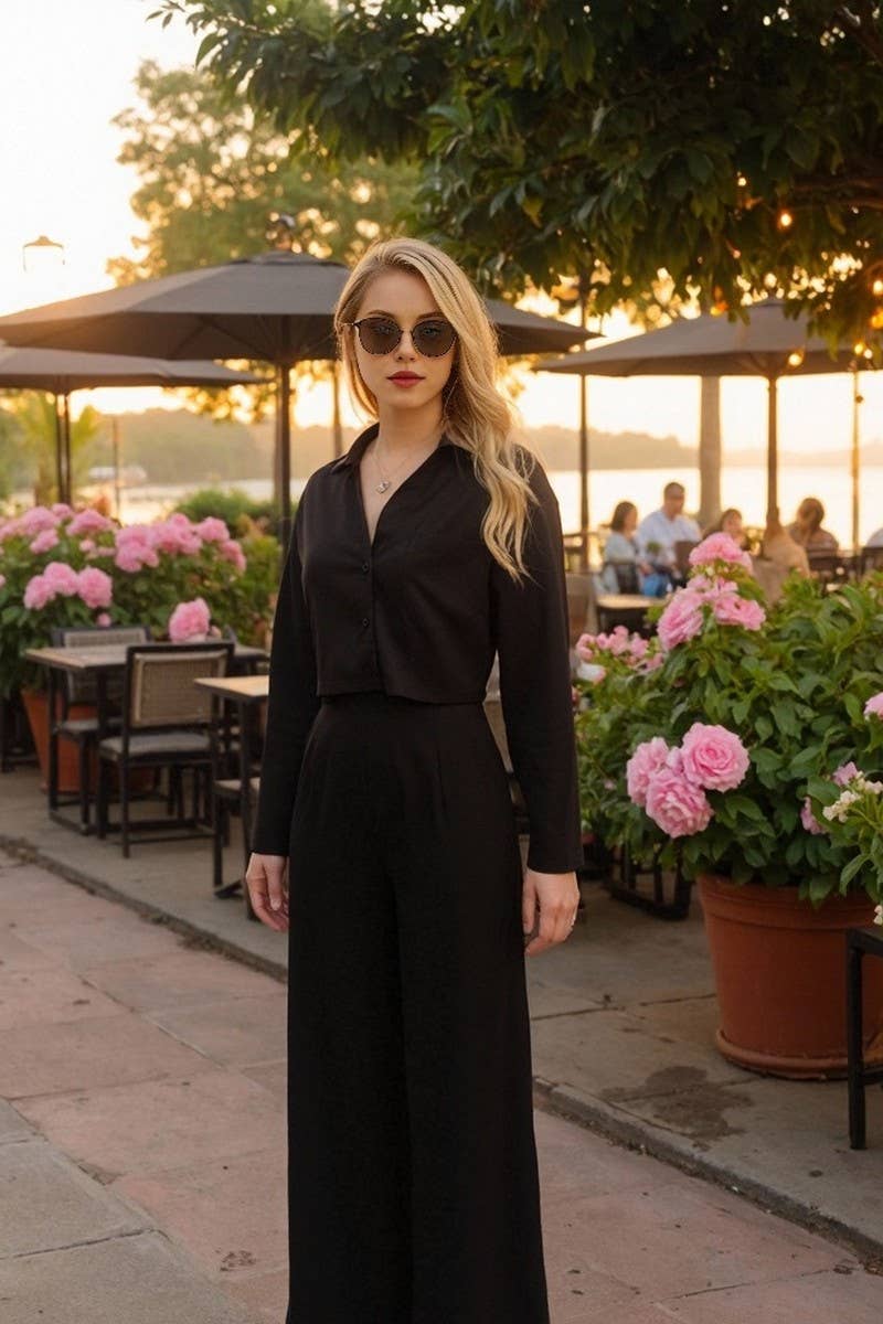 SOLID COLOR CROPPED SHIRT & PANTS SET FOR WOMEN
