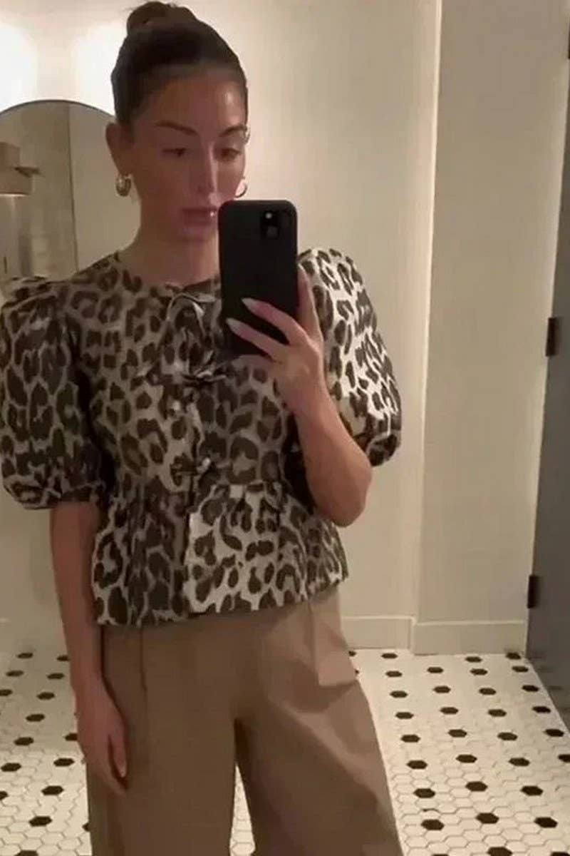SOLID COLOR PUFF SLEEVE PRINT LACE-UP SHIRT