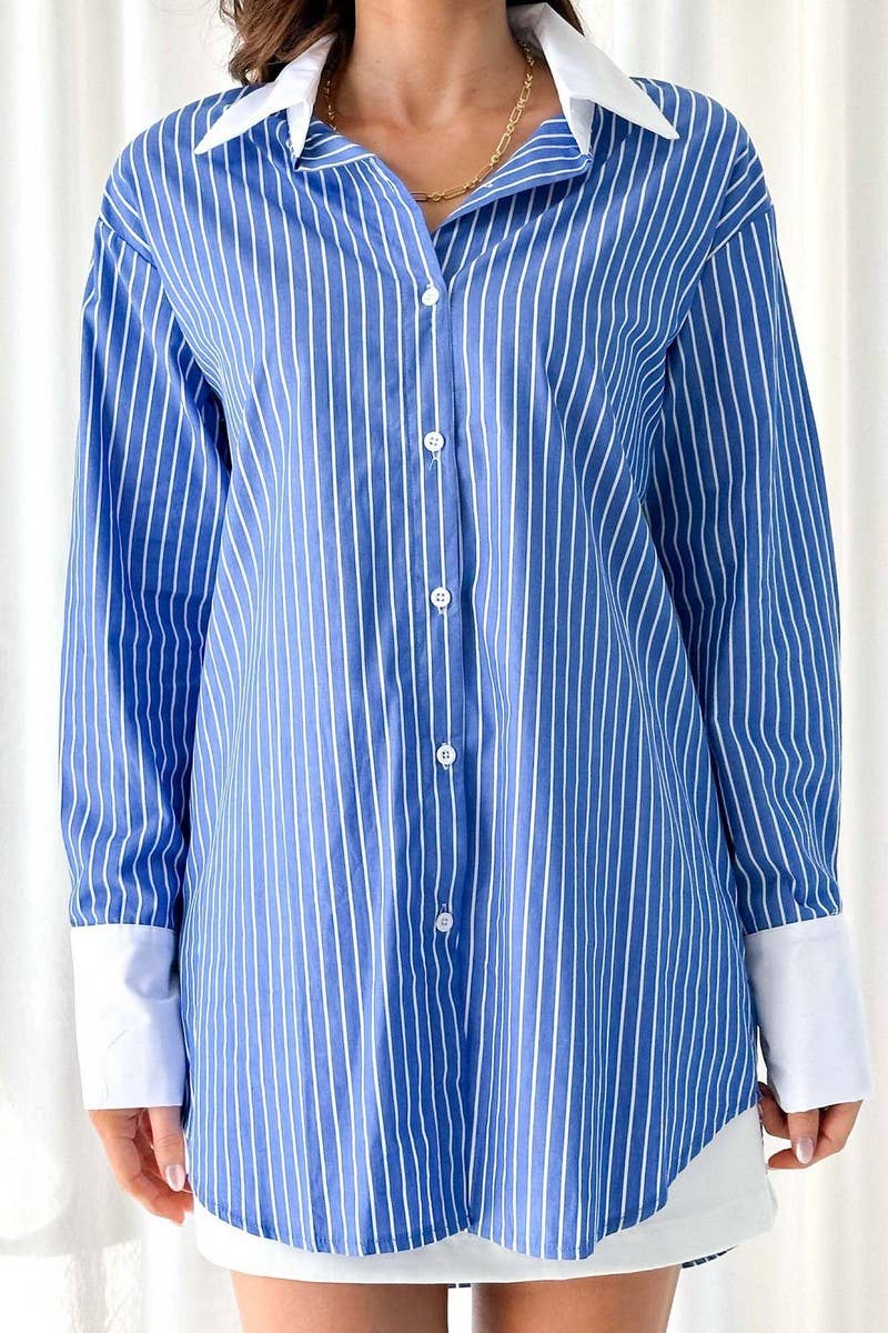 LAPEL BLUE AND WHITE STRIPED COLORBLOCK SHIRT