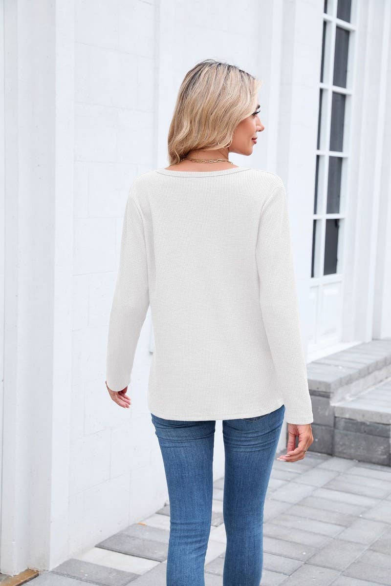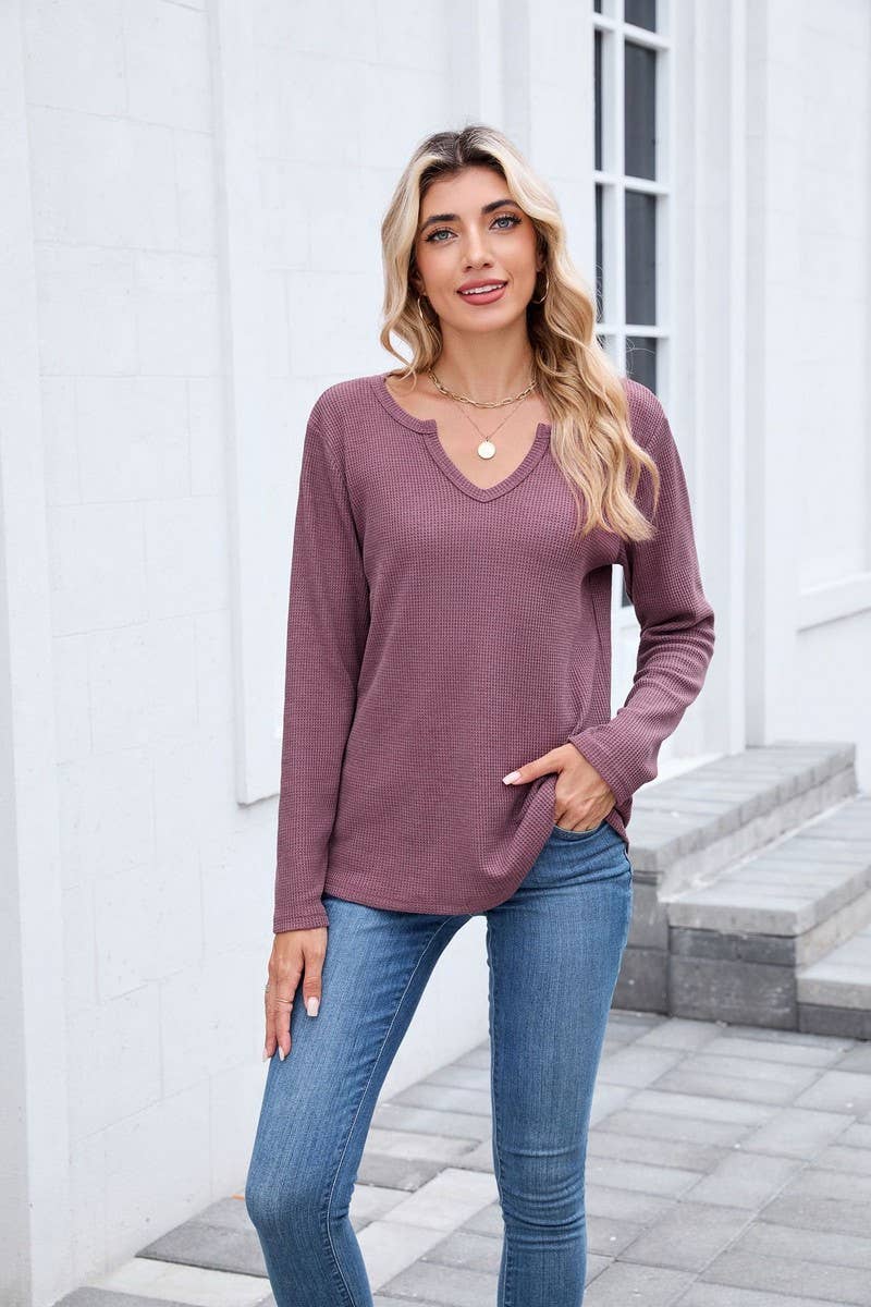 V-NECK WAFFLE LONG-SLEEVED LOOSE T-SHIRT TOP