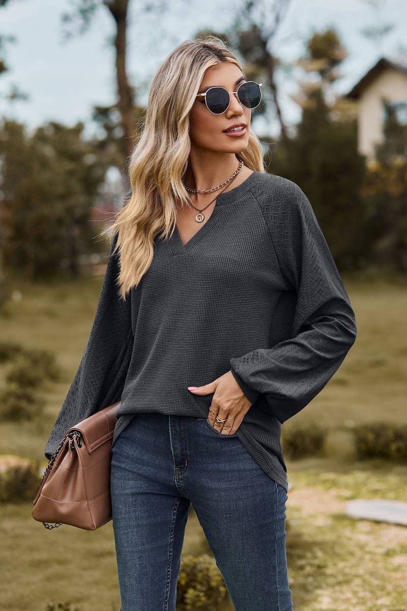 V NECK WAFFLE KNIT SOLID LONG SLEEVE LOOSE TEE