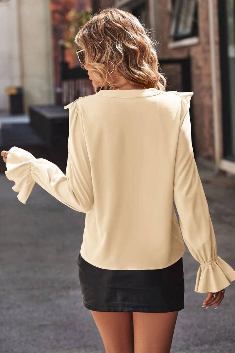 SOLID COLOR V-NECK RUFFLED TEMPERAMENT SHIRT