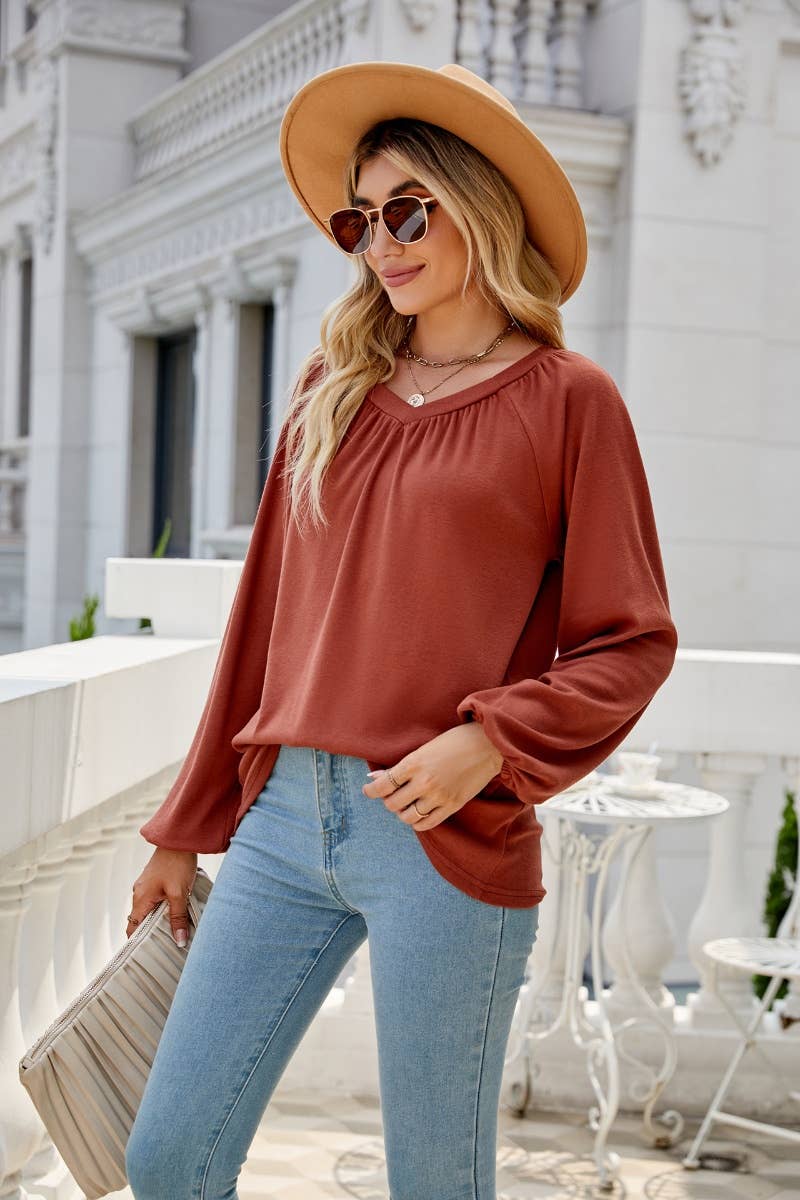LOOSE PLEATED V-NECK LONG SLEEVE TOP