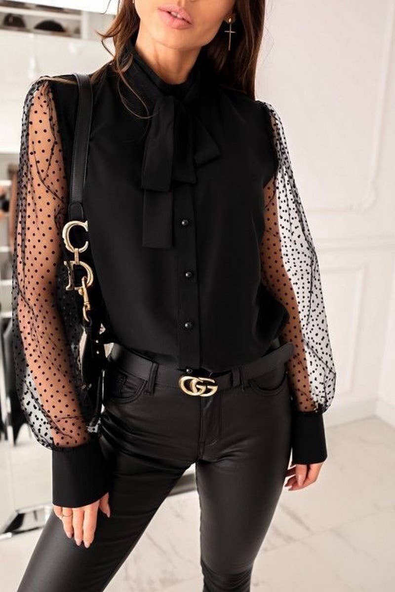 SOLID COLOR MESH SPLICING BUTTON BOW SHIRT