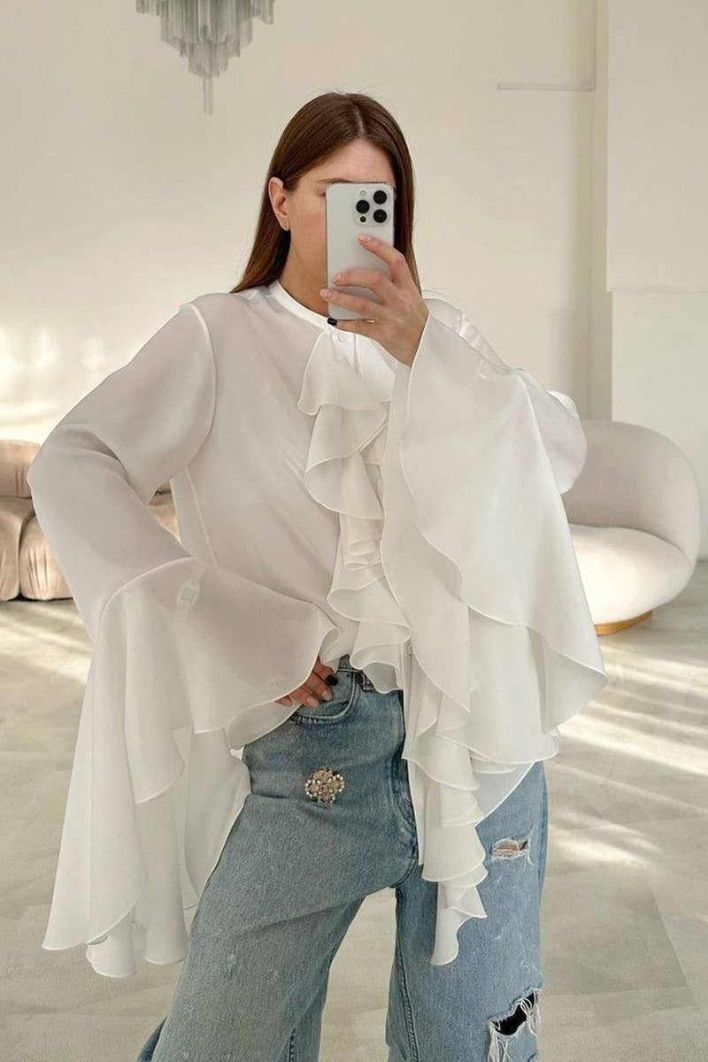 SOLID COLOR RUFFLED LONG SLEEVE SHIRT TOP
